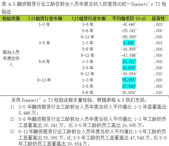 由表4.7可得出,就融资租赁行业工龄在“前台人员年度总收入”的差异比较而言,显著性P=0.000<0.05,已达到0.05显著水平,表示不同融资租赁行业工龄在“前台人员年度总收入”上有显著差异存在,至于是哪几对工龄组间的差异达到显著,需要进一步进行事后比较方能得知。
