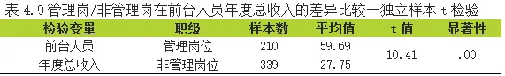 由表4.9可得出,就岗位职级在“前台人员年度总收入”的差异比较而言,显著性P=0.000<0.05,已达到0.05显著水平,由此,我们发现前台管理岗的年度总收入平均值显著的高出前台非管理岗31.94万。