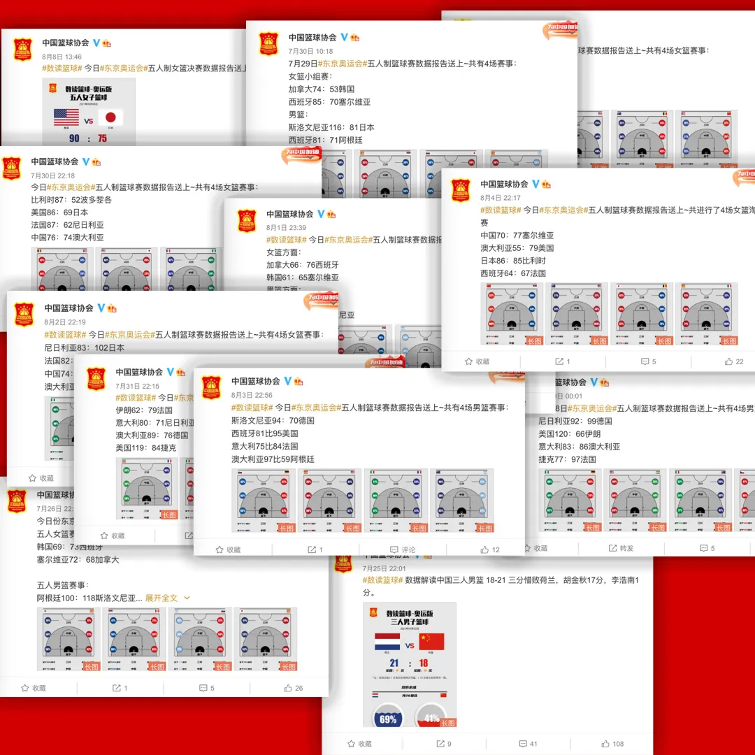 为建设并打造以球员、球队和赛事为核心的数据分析系统,在东京奥运会期间,中国篮球协会在中科人工智能创新技术研究院的支持下组建了专业的数据分析团队,首次推出奥运赛后数据报告——“数读篮球—奥运版”。(更多详情点这里)中国篮协微博也在奥运会期间,将五人制篮球和中国三人篮球的所有比赛数据报告呈现给了球迷们,供大家学习研究。