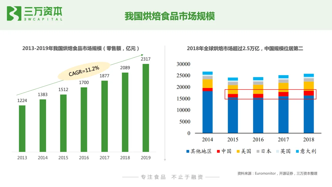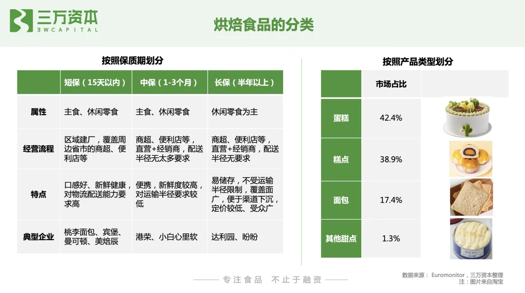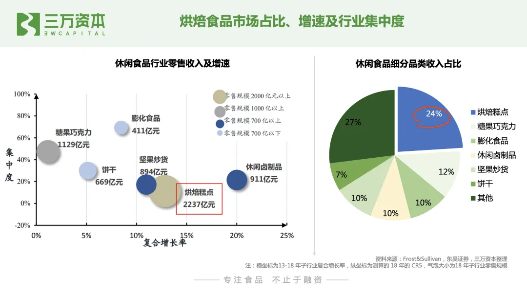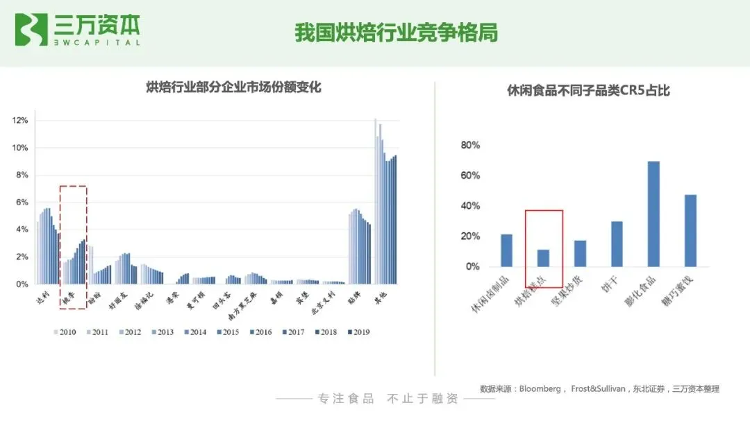 烘焙食品是以面粉、酵母、食盐、砂糖和水为基本原料,添加适量油脂、乳品、鸡蛋、添加剂等,经过一系列复杂的工艺手段烘焙而成的方便食品,从分类来看,按照产品种类和保质期可划分为不同的类型。按照种类划分,烘焙食品可以分为面包、糕点、蛋糕和其他甜点四大类;按照保质期划分,烘焙食品可分为短保产品(1-15 天)、中保产品(1-3个月)和长保产品(6个月以上)三大类。现代烘焙业虽然起源于西方,但烘焙糕点在我国拥有久远的历史,糕点制作早在商周时期就已经出现,传统烘焙食品以月饼、桃酥等糕点,及各地方特色糕点为主,消费场景主要为传统节日和饭后甜点,生产上以手工作坊为主,未形成产业化规模化。我国现代烘焙业起步于上世纪80年代,经过三十多年的发展,我国烘焙行业经营业态多元化,品类不断丰富,发展至今可划分为四大发展阶段。 1980-1989年,我国现代烘焙行业开始兴起。西式烘焙糕点从香港、台湾进入大陆市场,产品生产模式以家庭作坊为主,产品品类单一,渗透率低。1990-1999年,国外品牌陆续进入国内市场,国内现代烘焙企业出现并发展。1995 年,比利时 Artal 集团在上海投资建厂,生产销售曼可顿品牌面包;1997 年,韩国烘焙零食龙头好丽友在中国设立工厂进行生产销售。与此同时,徐福记、桃李面包、盼盼食品等国内烘焙糕点零售企业相继成立和发展。2000-2009年,烘焙企业步入快速增长期,线下品牌烘焙店发展。2003年新加坡烘焙连锁品牌包新语在国内开设第一家门店;2004 年,韩国烘焙品牌巴黎贝甜在上海开设第一家门店,日本烘焙龙头山崎面包设立上海分公司;2007 年,国际烘焙零食龙头宾堡在北京设立子公司,开始中国区域布局。外资品牌凭借品牌和资本优势在国内的市场占有率不断提升。2010年至今,本土企业逐渐主导市场,出现各种新型模式。烘焙产业呈现多元化业态,除了各类传统中西式烘焙糕点企业外,还涌现出众多互联网蛋糕品牌、线上烘焙品牌。购买渠道的便利化及烘焙食品代餐化趋势,促进了我国烘焙行业的快速发展。烘焙食品为休闲食品行业第一大品类,且增速快、行业集中度低,发展空间大根据Frost&Sullivan数据显示,2018年我国休闲食品行业市场规模为10297亿元,2012-2018年CAGR为12%。从细分行业占比来看,烘焙食品为我国休闲食品行业第一大品类,占比达24%,而位居第二的糖果巧克力,占比仅为12%。从增速来看,烘焙食品2013-2019年CAGR为11.2%,为休闲食品中第二大增速品类;从行业集中度来看,烘焙食品的CR5仅为11%,为休闲食品中市场集中度最低的细分品类。由此可见,烘焙食品与休闲食品其他细分品类比,市场规模最大,且保持高增速,市场集中度最低,烘焙赛道无论是行业内企业还是新入局的初创公司都存在很大发展空间。我国烘焙行业存量市场规模约2300亿,未来潜在市场空间约4700亿