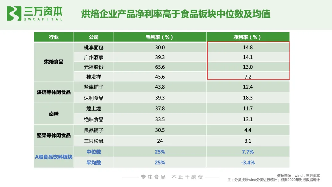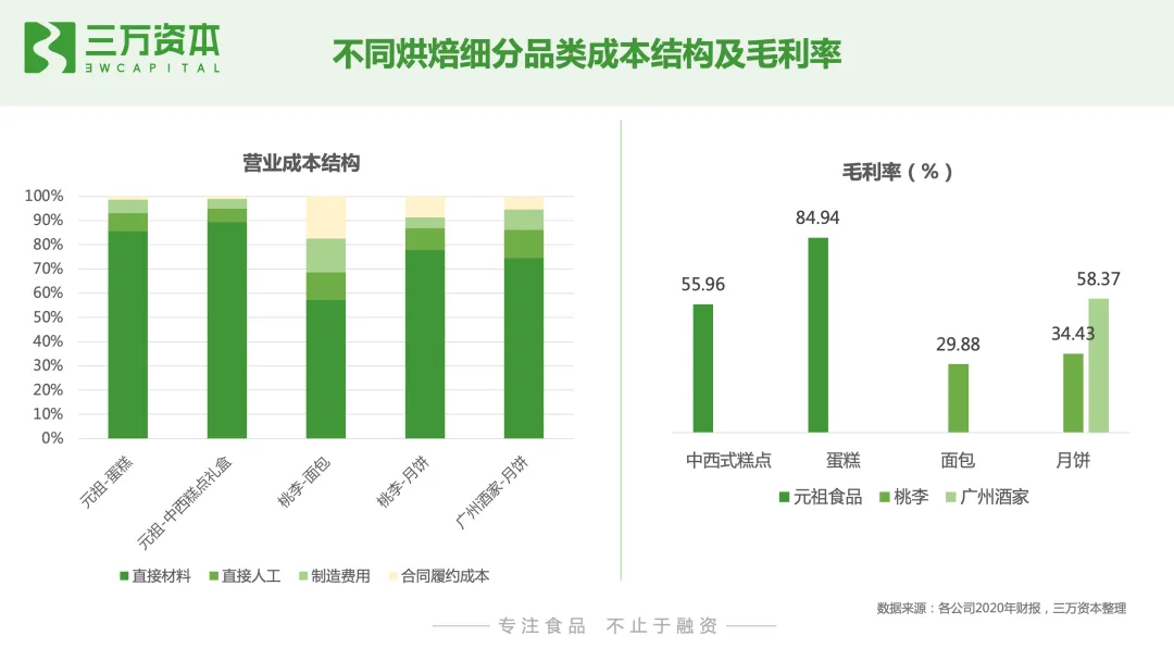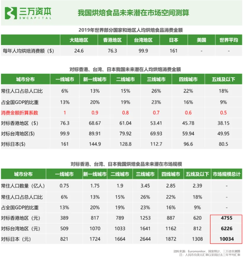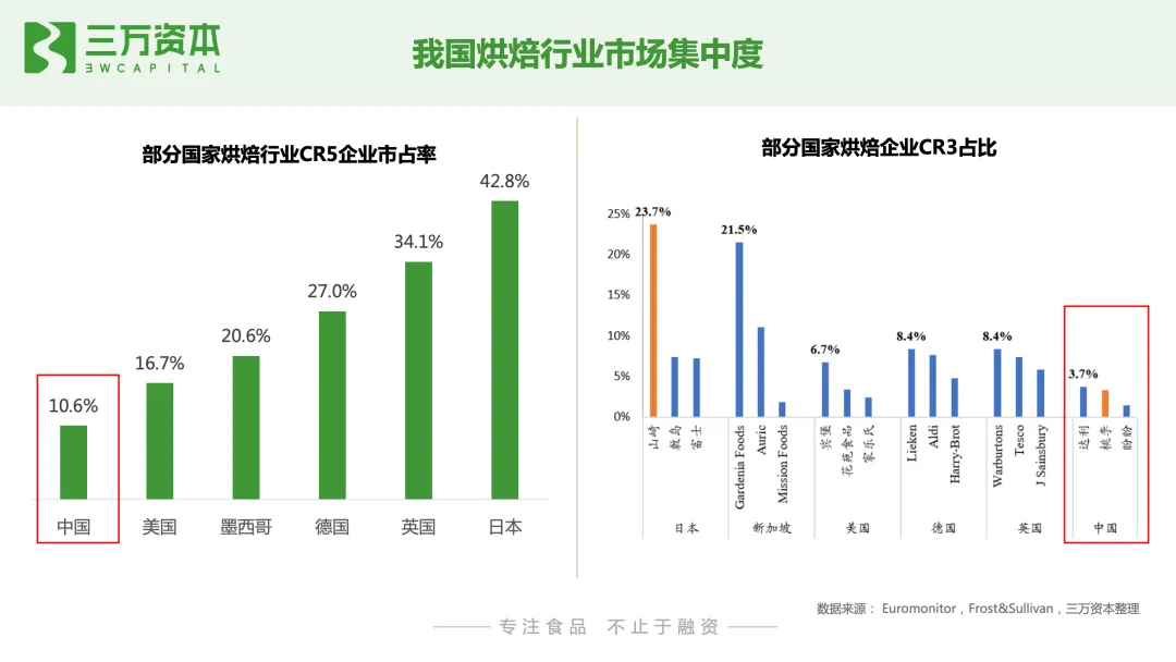 根据Euromonitor数据显示,2019 年我国烘焙食品零售额为2317亿元, 2013-2019年CAGR达11.2%。全球烘焙食品市场已超过 2.5 万亿元,我国仅次于美国,为全球第二大烘焙市场。从人均烘焙食品消费量来看,2017年,我国内地人均烘焙食品消费量为7.2kg,中国香港和日本地区分别为16.3kg和22.5kg,以烘焙食品为主食的英国、美国则分别高达48.5kg、40.2kg,世界平均的烘焙人均消费量为18.7kg,我国远低于世界平均消费量。从人均烘焙食品消费额来看,2019年,我国大陆人均烘焙食品消费额为 24.6 美元,处于全球后25%水平。而与中国大陆饮食文化相近的中国香港、中国台湾区及日本分别为76.3美元、99.9美元、161美元,分别是我国的3.1倍、4.1倍、6.5倍。我们通过对标香港地区、台湾地区和日本,来测算我国大陆烘焙行业未来潜在市场空间。考虑到中国幅员辽阔,不同地区经济发展水平差异大,从而导致人们消费水平不同。因此,按照经济发展水平对我国城市进行线级划分,对不同线级城市的人均烘焙消费金额进行系数折算,然后用人口数量乘以各线级城市的未来潜在人均烘焙消费金额,进而测算出我国烘焙食品零售端潜在市场规模。通过测算,取最保守的数值我国烘焙行业零售端潜在市场空间约4700亿。目前我国烘焙食品零售额约2300亿,说明未来我国烘焙行业还存在至少一倍市场增量空间。细分品类来看,蛋糕、糕点为我国烘焙行业最大的两个细分品类2019年,我国蛋糕和糕点的市场规模分别为982亿元、902 亿元。蛋糕作为舶来品,在发展初期主要是生日庆祝场景,糕点主要是传统节日庆祝或送礼场景,未来随着蛋糕和糕点往休闲下午茶等日常场景的延伸,将有效提高消费频次,从而推动市场规模持续放量。面包目前存量市场规模较小,为404亿,尚不足蛋糕、糕点的一半。面包在西方国家通常作为主食食用,未来随着我国烘焙食品代餐化趋势的发展,具有代餐属性且便于携带和储存的面包品类有望迎来快速发展。达利食品、桃李面包、盼盼、奥利奥和徐福记是我国烘焙行业top5企业。根据Euromonitor 数据显示,市占率居首的达利食品自2015年后,市占率呈不断下降趋势,截止2019年,达利食品占烘焙市场份额为3.7%,相比于2015年近6%的份额,下降趋势显著,主打短保面包的桃李市占率不断提升,2019年达3.3%,与达利食品不断接近。与其他休闲食品细分品类对比来看,我国烘焙品类的市场集中度远低于糖果、咸味零食等品类;与其他国家市场集中度对比来看,也远低于日本、英国、墨西哥、美国等国家。说明我国烘焙市场整体处于初步发展阶段,市场格局分散。我国头部烘焙企业年收入尚不足百亿,暂未有占领绝对优势的市场玩家,无论是原有市场参与者还是新入局企业都存在很大发展空间。从企业营业成本来看,烘焙产品原材料通常占总成本的60-80%,直接人工成本占5-10%左右,制造费用占5-10%,物流成本占比在5-10%。对于桃李等短保类预包装产品来说,对物流和产品周转率要求高,因此物流成本在成本结构中占比高;蛋糕、糕点等烘焙门店现制食品毛利率通常高于面包等预包装产品。烘焙食品企业的净利率通常在8-15%之间,而A股食品板块企业的净利率的中位数为7.7%,可见烘焙食品企业利润普遍高于其他食品企业。较高的利润空间,也有利于企业在发展初期有相对宽裕的营销推广费用。从烘焙企业研发费用支出来看,A股食品板块上市公司的研发费用率的中位数是1.06%。烘焙板块相关上市公司中,桃李面包的研发费用率仅为0.19%,元祖食品为0.74%,远低于中位数。而烘焙原料企业南侨食品、立高食品、海融科技分别高达3.72%、2.91%、3.87%,远高于中位数,可见上游烘焙原料生产企业研发支出占营业收入的比重高于下游面包糕点等生产销售企业。从消费场景来看,人们对烘焙食品的消费可分为主食代餐、休闲下午茶、节日送礼及生日庆祝四种场景,不同的消费场景对烘焙产品的消费品类有所差异。主食代餐场景:目前我国以早餐消费场景为主,从产品品类上来看,以短保面包、吐司等西式烘焙食品为主。