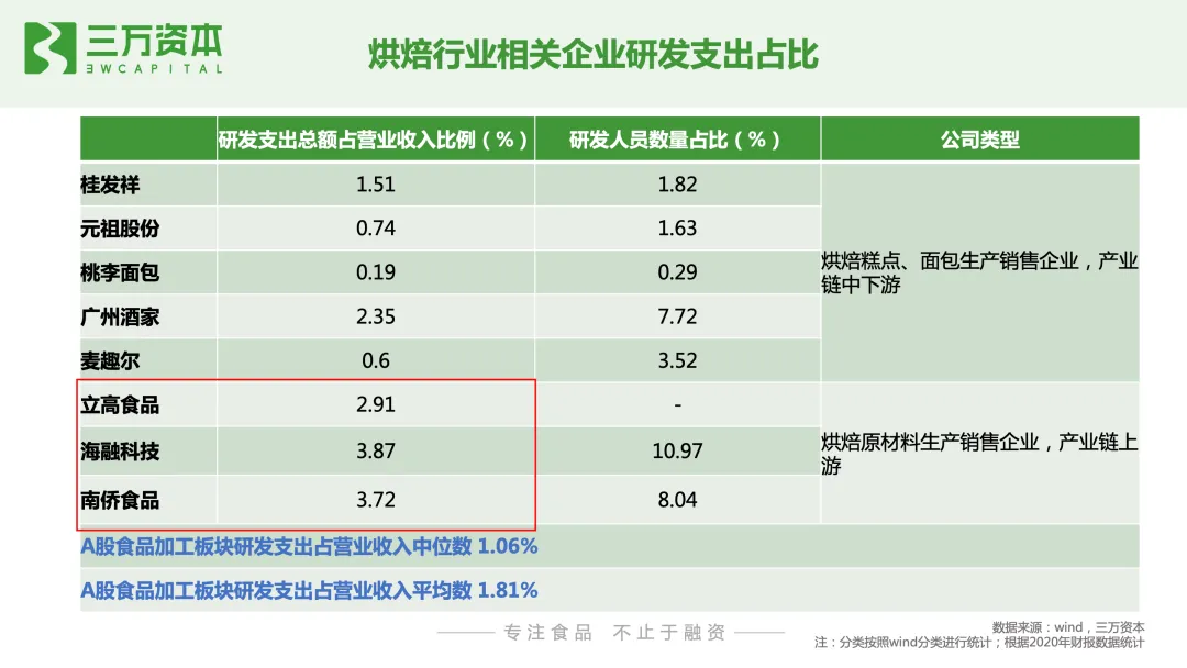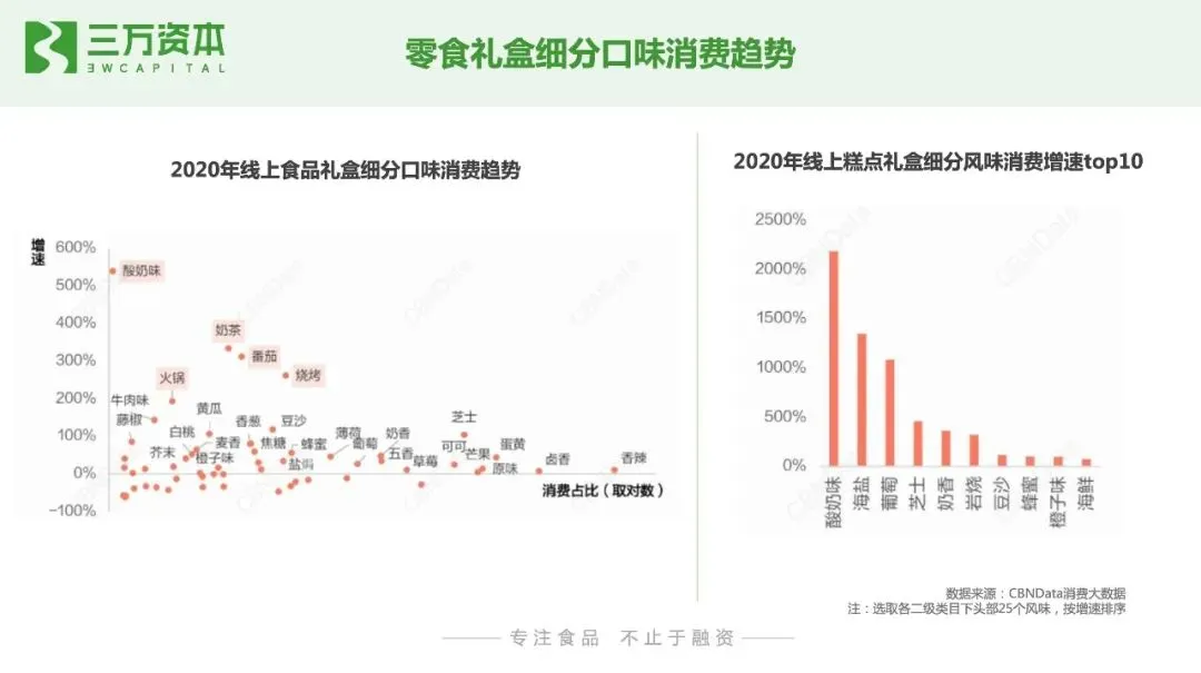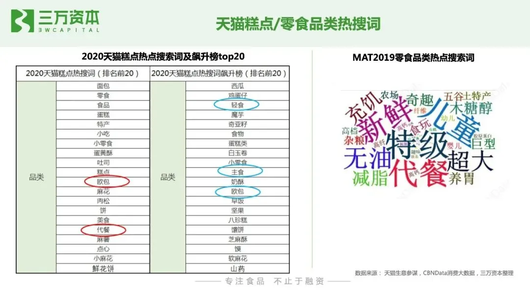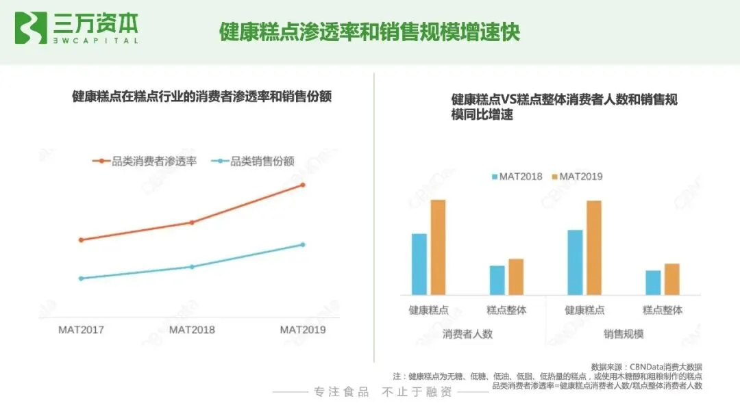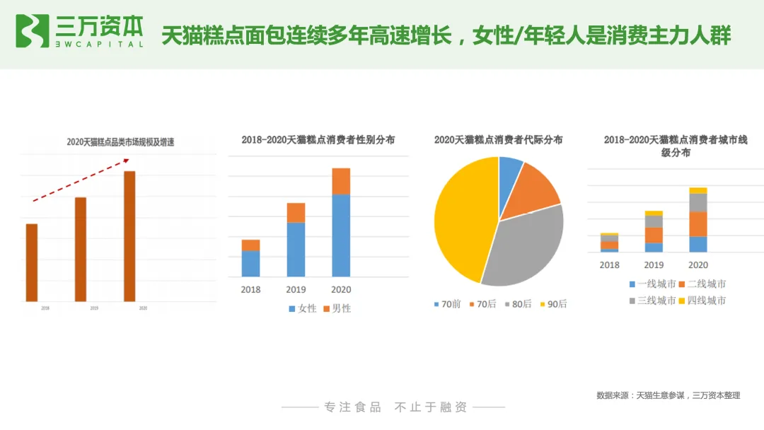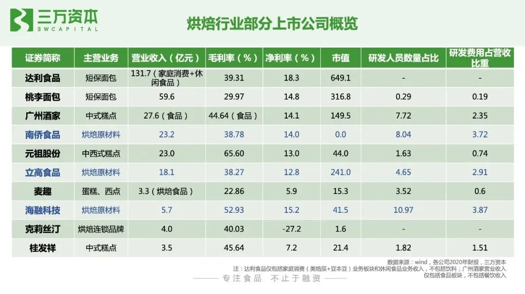 烘焙行业进入门槛低,市场参与者重多,产品同质化严重,如何保持产品持久的创新能力和品牌力是发展关键。目前无论是线下新式烘焙连锁店,还是预包装烘焙产品,都暂未出现占领用户心智和市场份额的绝对头部品牌。初创企业有望通过产品创新,打造爆款单品,成为某一细分品类的市场定义者,通过研发能力不断迭代产品,强化用户复购和认知,建立企业自身壁垒和行业竞争力。最后总结一下,我们看好以下几个烘焙食品的赛道创业和投资方向:1. 新鲜、健康、低糖低油的短保和中保烘焙产品。随着国内消费者健康意识的崛起,新鲜、无/少人工添加剂的短保烘焙食品契合消费者日益提升的健康诉求。此外,烘焙食品代餐化的发展趋势也推动了烘焙食品消费由中长保向短保升级,比如主打燕麦烘焙产品的生来有趣。2. 融入现代元素的中式糕点。我国传统烘焙糕点细分品类众多,但除了月饼和粽子有头部品牌外,其他品类处于有品类无品牌的发展阶段。年轻一代消费者对国潮国货认可度高,融入现代审美元素,新兴口味和便于携带存储的健康中式糕点将焕发新的生命力。如主打荷花酥的百年同和,主打桃酥的泸溪河和詹记。3. 线下中西式烘焙连锁小店。烘焙连锁小店优化了老牌烘焙连锁店的单店模型,投入成本低,坪效高,品类少,产品标准化程度高,前端易操作,有利实现规模化复制,小店更容易跑出大连锁品牌。4. 儿童健康烘焙食品。年轻一代消费者健康消费意识将会传导到对儿童食品的购买偏好, 近年来,儿童零食增速远高于零食品类整体增速,但目前还暂未还没有出现针对儿童健康零食的绝对领先品牌,初创品牌有很大的发展空间。5. 具有研发能力的烘焙原辅料企业。下游烘焙食品的增长将持续推动上游烘焙食品原辅料企业的发展,近半年已有三家烘焙原材料厂商相继登陆A股,分别为海融科技、立高食品和南侨食品。此外,烘焙食品消费习惯的形成将会推动家庭烘焙的发展,家庭烘焙电器和工具耗材将迎来发展机会。