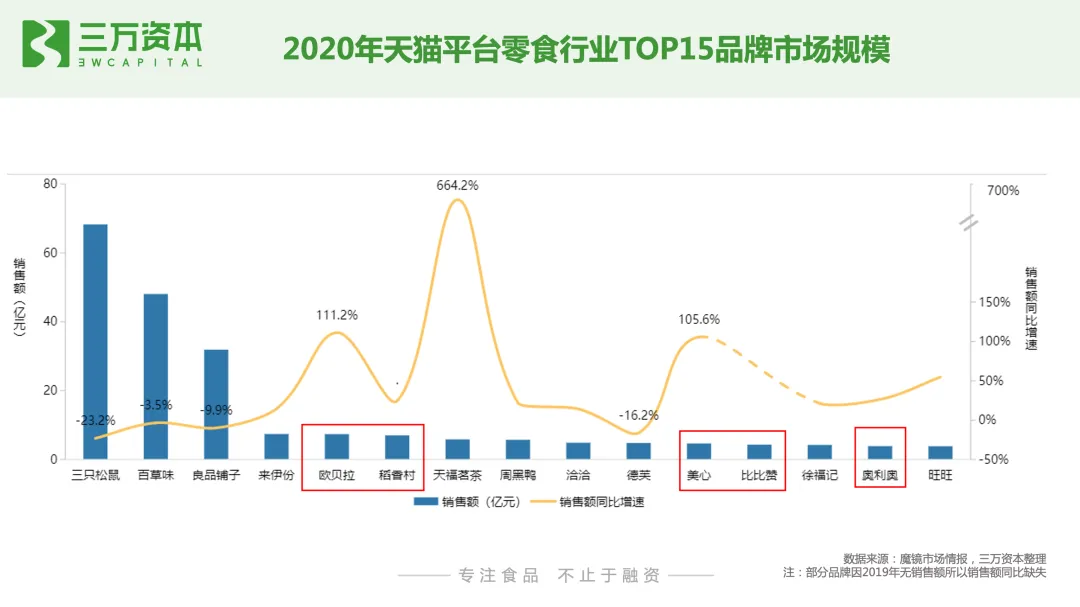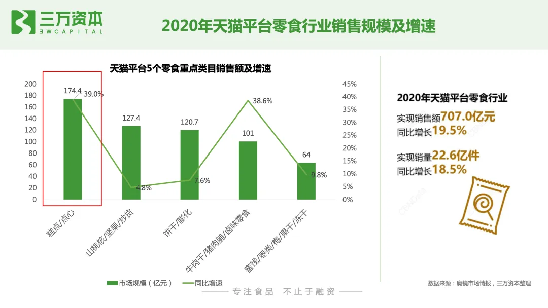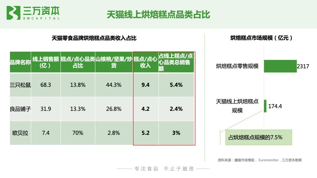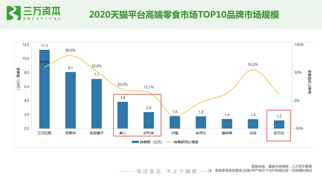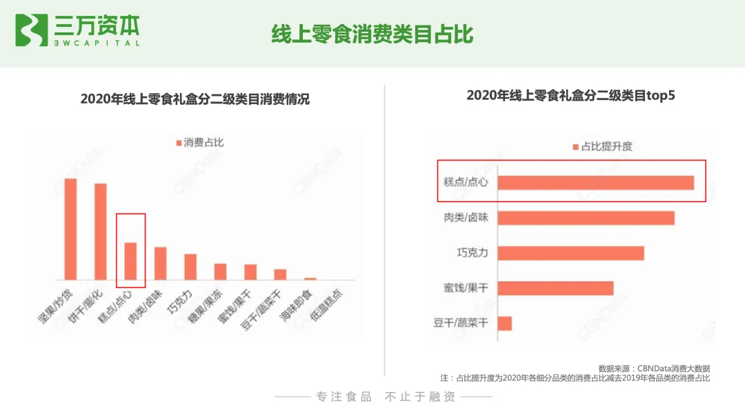 从线上烘焙消费者画像来看,同线下烘焙连锁店一样,线上烘焙糕点消费者人群,仍然以女性和90后年轻一代为主。从市场规模来看,烘焙糕点是休闲零食第一大子品类,从线上渠道来看,其同样是线上零食行业的第一大子品类。根据魔镜市场情报数据显示,2020年天猫平台零食行业全年销售额为707亿,同比增速19.5%,实现销量22.6亿件,同比增长18.5%。其中,糕点/点心销售额为174.4亿,同比增速为39%,远高于零食行业整体增速,说明消费者线上购买糕点/点心的需求旺盛。此外,值得一提的是,线上消费者对高端糕点的需求上升。2020年天猫高端零食销售额为129.1亿元,同比增长46%,占零食行业中整体销售额的18.5%。2020年高端零食市场各季度销售额同比增速均超过了15%,且各季度同比增速明显高于零食行业整体。就烘焙糕点来说,2020年高价格带的糕点商品成交额、搜索曝光和笔数转化率同比增速均高于中低价格带。线上高端零食TOP10品牌中,以坚果和糕点类品牌为主,烘焙糕点占据三席,分别是美心、好利来和欧贝拉,但是销售额相比糕点坚果较小,随着消费者对线上高端糕点需求的上升和接受度的提高,未来线上高端糕点销量有待不断放量。从线上零食品牌竞争格局来看,三只松鼠、百草味、良品铺子、来伊份、欧贝拉是我国零食行业线上top5品牌,2020年5大品牌的线上销售额分别为68.3亿元,48.1亿元,31.9亿元、7.4亿元,7.4亿元,5大品牌同比增速分别为-23.2%、-3.5%、-9.9%、14.9%、111.2%,以糕点为主营业务的欧贝拉增速迅猛。在休闲食品线上top15品牌中,主营业务为糕点的有5个品牌,分别是欧贝拉、稻香村、美心、比比赞及奥利奥,销售额第一的欧贝拉糕点/点心收入仅为5.18亿,占线上糕点/点心品类总销售额的3%。值得一提的是,主营业务为坚果的三只松鼠糕点品类收入已达9.4亿,占线上糕点总销售额的5.4%;良品铺子糕点类收入为4.2亿,占线上糕点总销售额的2.4%。说明烘焙线上市场分散,暂未有明显优势的头部品牌,品牌仍有很大增长机会;另一方面也说明了,其他品类的零食类企业糕点业务发展迅速,面对其他品类头部企业的竞争,糕点类企业要有自身鲜明的定位和差异化优势。天猫线上烘焙糕点销售额占烘焙糕点整体零售额的7.5%,线上烘焙糕点渗透率提升空间大。