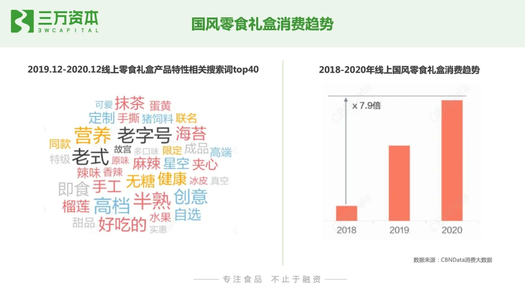 从消费场景来看,零食礼盒的消费场景不断延伸,除了佳节礼品馈赠场景,零食礼盒在下午茶/夜宵、伴手礼等日常场景也占据了较强的用户心智;从人群来看,女友、儿童/宝宝、男友是品类重点赠送对象。烘焙糕点早期主要作为礼品在中秋节、春节等传统节日馈赠,随着年轻一代用户对烘焙糕点消费的日常化,其消费场景将不断延伸到日常社交礼品馈赠场景,提高了其消费频次。国风礼盒消费增速迅猛,2020年同比2018年,增速达7.9倍;在相关关键词搜索中,“老字号”“老式”突出,说明消费者对国潮元素国货的认可;此外,健康、营养、高档、好吃等也是消费者重要关注因素。