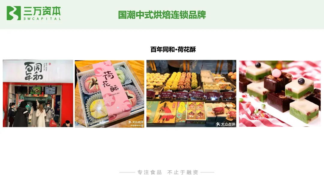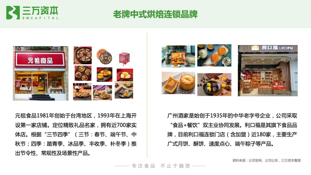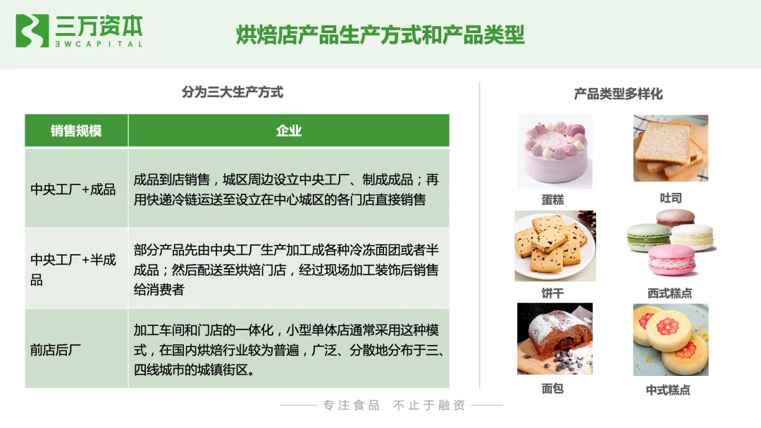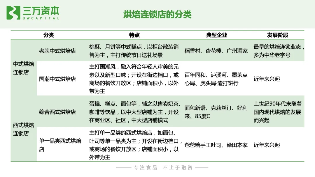 蛋糕从外在颜值到原材料都不断升级。蛋糕外观颜值契合不同的消费场景,表达消费者的情感寄托和祝福。从原材料来看,除了奶油、水果、蛋糕胚等基础配料,配料不断丰富,豆沙、红丝绒、榴莲口味等,食材在丰富化,健康化。从供给侧来看,按照流通渠道的不同,烘焙食品企业可划分为烘焙连锁店、线下零售品牌和线上电商品牌三种类型。需要注意的是,目前很多品牌采取全渠道运营模式,已不局限在单一渠道,以上的划分方式仅按照该品牌在发展初期的主要布局渠道或者营业收入的主要渠道来源对企业进行归类。烘焙连锁店通常在城市人口密集的商业区和居民区开设门店,在城区周边设立中央工厂制作成品或半成品配送到门店销售,或者采取前店后厂的方式,在门店进行产品现烤制作并销售,涉及产品类型多样,如蛋糕、中西式糕点、面包等各类烘焙食品。按照产品类型的不同,烘焙连锁店可以分为中式烘焙店和西式烘焙店两大类。中式烘焙店分老牌中式烘焙店,以柜台散装销售为主,主打传统节日送礼场景,如稻香村、杏花楼、广州酒家等;和新型中式烘焙店,将传统糕点融入现代人喜欢的元素和口味,主打国潮风,如百年同和、虎头局渣打饼行、墨茉点心局、泸溪河等。