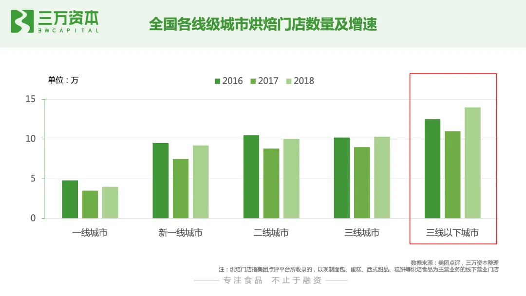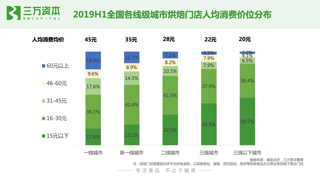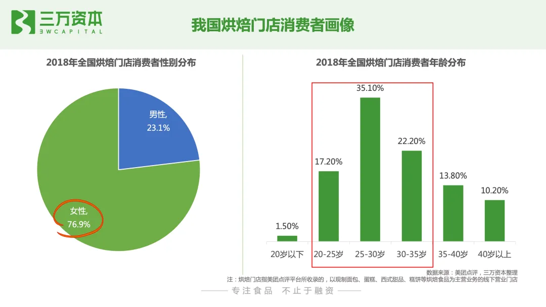老牌中式连锁店是我国发展最早的烘焙连锁业态,很多为中华老字号;综合西式烘焙连锁店,上世纪九十年代随着我国现代烘焙业的发展而兴起,近年来增长乏力,众多品牌出现倒闭和关店潮;主打单一品类的西式烘焙店和国潮中式烘焙店为近年来新出现的烘焙店业态,增长迅猛。根据美团点评发布的报告数据显示,截至2019年上半年,全国烘焙门店数量已接近50万家。从城市分布来看,三线以下城市门店的涨幅最大,达26.2%。一线城市烘焙门店在全国门店总量中的占比持续下降,其占比由2016年的9.9%下降至2018年的8.2%。新一线、二线城市烘焙门店占比也呈下降趋势;而三线以下城市门店占比则呈增长趋势,其占比由 2016 年的48.8%上升至2018年的 51.8%,说明烘焙市场在加速往低线城市渗透。从烘焙门店类型来看,以面包蛋糕类门店为主,但占比呈下降趋势,由2016年的84.6%,下降到2018年的80.9%;中式糕点类门店占比呈上升趋势,由2016年的6.2%上升到2018年的10.4%,但整体占比仍较低,未来仍有很大提升空间。从烘焙门店消费者画像来看,女性消费人群占比高达76.9%,是烘焙门店主流消费人群。年龄分布上,35.1%的烘焙门店消费者年龄在25-30岁之间,说明刚步入职场的年轻人群是烘焙门店的典型人群;其次是30-35岁的消费者,占比为22.2%。总体而言,75%的烘焙门店消费者年龄在20-35岁之间,可见年轻人,尤其是年轻女性消费者是烘焙门店消费主力军。从烘焙门店人均消费价位分布来看,2019H1一线城市烘焙门店人均消费均价为45元,是三线城市人均消费均价的两倍。三线及以下城市87%的烘焙门店人均消费均价在30元以下,人均消费客单价为20元,中低端消费仍是主流。1.2 综合西式烘焙连锁店