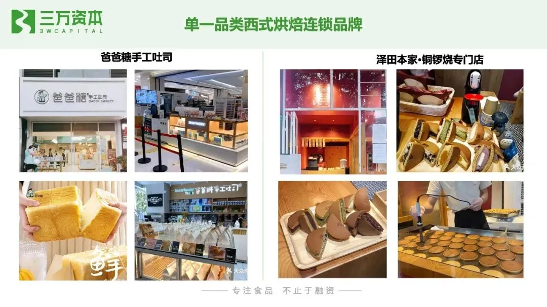 西式烘焙店分为综合西式烘焙店,售卖蛋糕、中西式糕点、面包等,辅之以销售奶茶、咖啡等饮品,以中大型店铺为主,如面包新语、克莉丝汀、好利来;主打单一品类的西式烘焙店,店铺面积通常较小,主要售卖面包、吐司、蛋挞等单一品类,如爸爸糖手工吐司、泽田本家等。