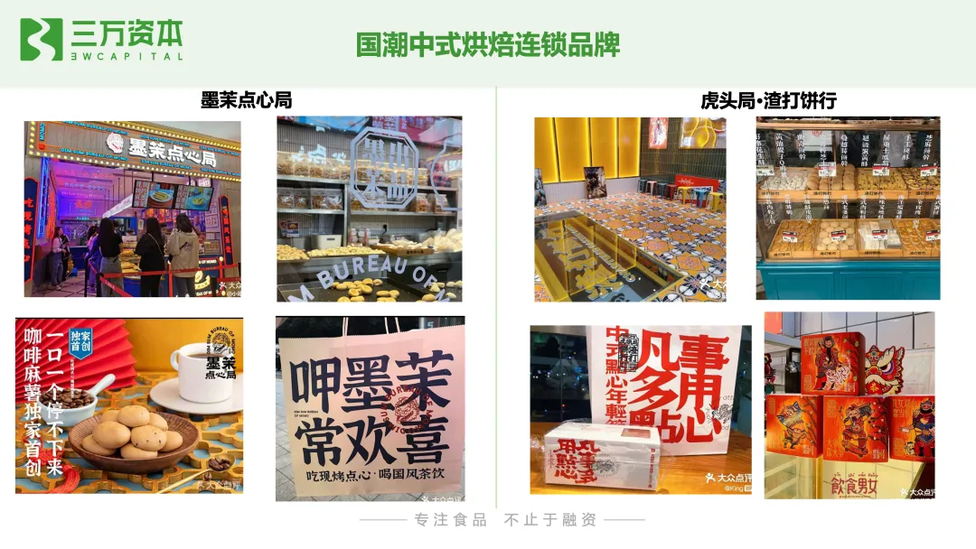 在综合西式烘焙连锁店不断关店的同时,国内西式烘焙连锁品牌并没有停止发展的步伐。新型西式烘焙店主打单一品类,如吐司、铜锣烧、蛋挞等。通常开设在街边档口或商场的餐饮开放区,面积较小,以外带为主。从企业运营模式来看,这类店铺产品品类单一,有利于标准化生产;店面面积小,员工数量少,降低了房租人力等固定成本支出。从产品类型来看,单一品类西式综合店主打某一品类,卖点上突出专业性,虽然相比于普通烘焙门店,产品单价高很多,但由于配料更好,质量口感好,主打差异化,通过高品质产品吸引顾客。1.4 国潮中式烘焙连锁店