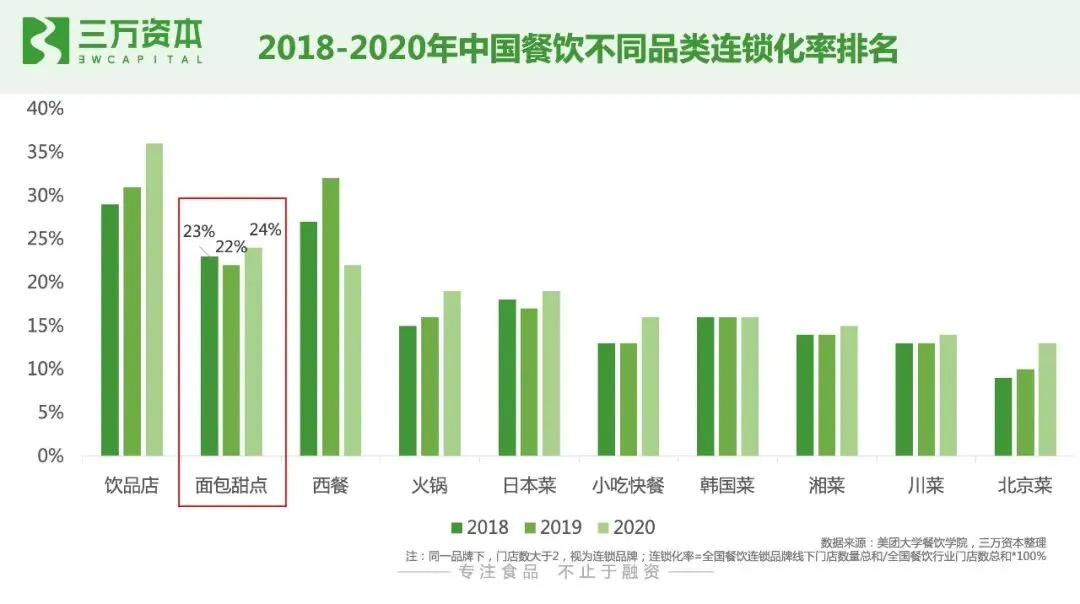 不同于老牌中式烘焙店的单调装修,国潮中式烘焙店将年轻人喜欢的国潮元素融入传统糕点,从店面装修、包装设计、文案都符合年轻人审美,并将传统糕点与现代口味结合。同单一品类西式烘焙连锁一样,这类店铺通常开在街边档口以及商场的餐饮开放区,以中小型店铺为主,店面面积较小,没有或仅有几个简单的座位,产品以外带为主,降低了房租人力等固定成本支出。从产品上来看,国潮中式烘焙连锁品牌主打某一爆款糕点,但同时店铺也售卖其他产品,如主打荷花酥和女王蛋挞的百年同和,主打麻薯的墨茉点心局。产品单价低,通常在10元以内,降低了消费者决策和尝试门槛。烘焙行业进入门槛低,无论是老牌中西式烘焙店,还是新兴中西式烘焙店都存在产品同质化问题。时尚的包装和爆款单品能够获得一时的关注,但如何能够做到持续长久发展,提高消费者复购率而不只是一时尝鲜是竞争关键所在。对标同样门槛低的线下茶饮门店来看,茶饮行业近来跑出了主打高端、天然的新式茶饮品牌喜茶和奈雪的茶,以及主打性价比和下沉市场的蜜雪冰城、古茗。烘焙连锁品牌要确定好自身产品的定位,满足目标消费者的需求,成为某一细分产品的代表,占领用户心智。提高自身产品研发能力和新品迭代能力,打造品牌能力,保持老用户的粘性,建立品牌壁垒。根据美团大学餐饮学院的数据显示,连锁化率第一的饮品店,单店模型跑通后,在资本的助力下,头部品牌加速跑马圈地,连锁化率增长一骑绝尘。千店规模以上的连锁门店数连续三年稳定在三成左右,2020年蜜雪冰城更是进入万店俱乐部,书亦烧仙草和古茗也分别突破5000家和4000家。
