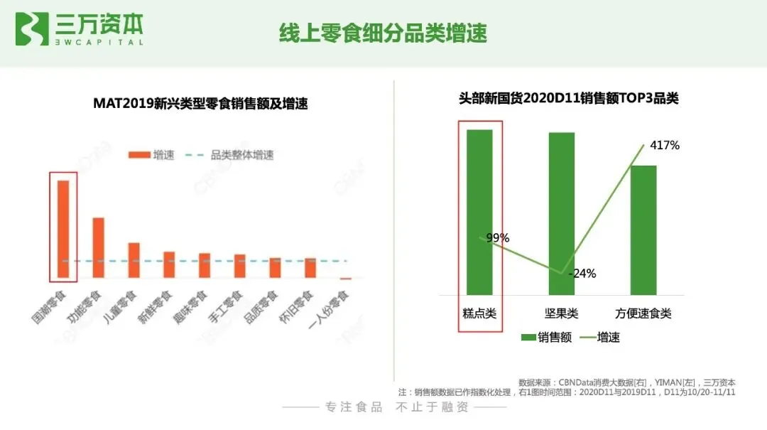 目前线上烘焙品牌主要分为两种模式切入市场,一种主打代餐需求,如欧贝拉、七年五季、田园主义、生来有趣,囤货心智明显;二是打大单品策略,如专注于榴莲口味糕点的榴芒一刻,专注于蛋黄酥的轩妈。从线上糕点品类搜索热词来看,主食、健康代餐轻食等功能需求成为消费者在购买糕点时的关注热点。国潮零食在MAT2019销售增长超过四倍,显示出“国潮”巨大的吸引力;休闲零食品类中,糕点类销售额位列头部新国货首位,且保持高增长趋势。根据Ipsos报告显示,2020年Q3淘宝天猫减糖/无糖概念top10销售榜中,烘焙糕点相关产品占据6席。由此可以看出,消费者在线上购买烘焙糕点时,新鲜、代餐、减糖、无油、充饥是其主要诉求。