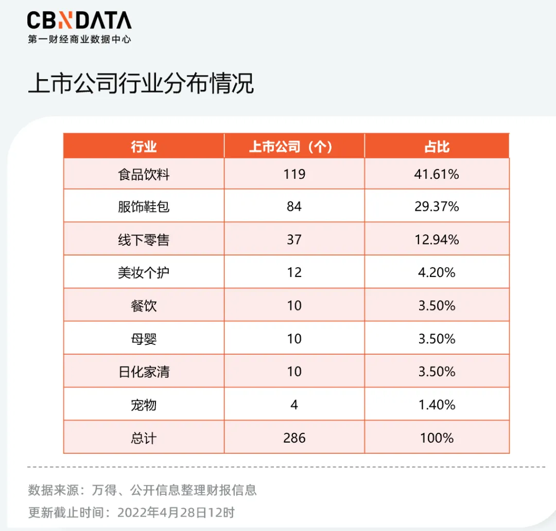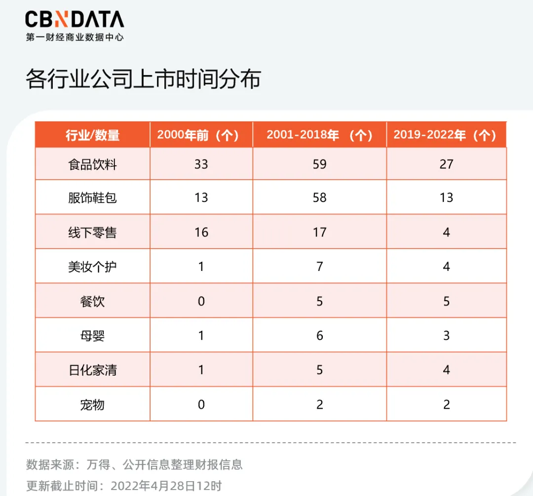 当然,部分公司单个季度的业绩无法说明它的发展和问题。我们无法在不确定中预知消费行业的2022年将会如何,但过去的2021年,我们或许可以从它们的年报数字中看到其真实的一面。每年的3到5月份都是上市公司的年报季,截至到4月底,本土消费类上市公司年报也已相继发布。这其中,我们看到了年营收几乎翻倍的安踏,也有“大象转身”,承受着亏损压力的海底捞。2021,中国消费行业到底怎么样?除了备受关注的头部品牌,还有公司哪些值得复盘和剖析?曾在2021年收获万千关注的细分赛道,有收获名副其实的增长吗?在这个年报季,C站特地从服饰鞋包、美妆个护、母婴、宠物、线下零售、食品饮料、餐饮、日化家清8个赛道中,盘点出286家本土消费上市公司的业绩,从数据角度带你回看“消费品牌们的2021”。① 本系列文章数据统计范围为A股/港股/美股中食品饮料(不含农业)、服饰鞋包(不含纺织类)、美妆个护、日化家清、线下零售、餐饮、母婴、宠物的本土消费企业;② 由于母婴、宠物本土上市企业数量较少且财报未全部披露,因此不做重点分析;③ 如无单独说明,本文文字及图表所涉及金额均以人民币计算。总体来看,286家上市公司中,从事食品饮料和服饰鞋包行业的公司最多,二者共203家,占比70.98%,其次是线下零售行业,有37家上市公司。餐饮、母婴和日化家清行业分别有10家公司上市,宠物行业上市公司最少,仅有4家。2000年之前上市的公司主要分布在食品饮料、服饰鞋包和线下零售三大行业。食品饮料行业在2001-2018年间上市的公司有59家,2019-2022年间上市的公司有27家,结合时间长度来看,2019-2022年期间食品饮料行业迎来上市潮,上市公司以乳品、饮料、零食为主,其中有不少新消费品牌,比如经营零食坚果的三只松鼠,新茶饮品牌奈雪的茶,功能饮料品牌东鹏饮料,甚至是新消费品牌背后的生产商,如2022年上市的三元生物主要生产赤藓糖醇,是元气森林的代糖生产商,这些新消费品牌集中在2019年之后上市,一定程度上反映的是食品饮料行业的新消费需求。线下零售行业在2019年以前上市的公司占比高达89.19%,近4年上市的公司很少,这和线下零售行业的性质有关。作为最传统的行业之一,早先线下零售承担着一代人衣食住行等消费需求,许多零售商场凭借雄厚的资金和国家政策支持在全国进行扩张,这也推进了百货业的连锁规模发展。但近年来随着电商的发展,人们的消费习惯发生了改变,线下零售和实体商业均受到冲击,加上疫情的影响,许多线下零售不得不闭店缩紧开支。2019-2022年线下零售行业仅有4家企业上市,分别是国光连锁、名创优品、三江购物和巴比食品,其中名创优品是居家生活用品零售商,巴比食品是融合早餐和新零售电商的中式食品公司。 美妆个护行业在2001-2018年期间上市的公司共7家,主要是综合型的美妆日化企业,比如2001年上市的上海家化产品涵盖美妆、个护家清、母婴等多个领域,旗下有多个品牌和业务分支。2019-2022年上市的公司主要以经营美妆和护肤产品为主,以一两个品牌出圈,比如2020年上市的逸仙电商主营业务是美妆产品,主打品牌是完美日记,2021年上市的贝泰妮专注功效护肤,主打品牌是薇诺娜。餐饮行业同样在2019年迎来了上市热潮,短短四年出现了5家上市公司,公司业务涉及调味品、火锅、酒饮等。母婴、宠物和日化家清行业受上市潮的影响不明显,主要是由于面向的人群范围较窄,但宠物行业2019年以后上市的公司占比50%,一定程度上说明行业的市场规模和需求正在增长,未来存在潜力。综合各个企业的营收,我们大概可以看到以下几个特征:注:由于A股、港股、美股的营收计算方式不同,因此我们将分版块观察各个公司级行业的表现。