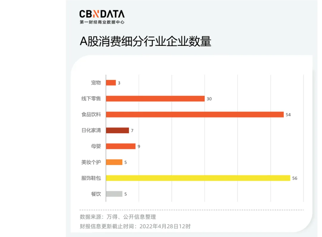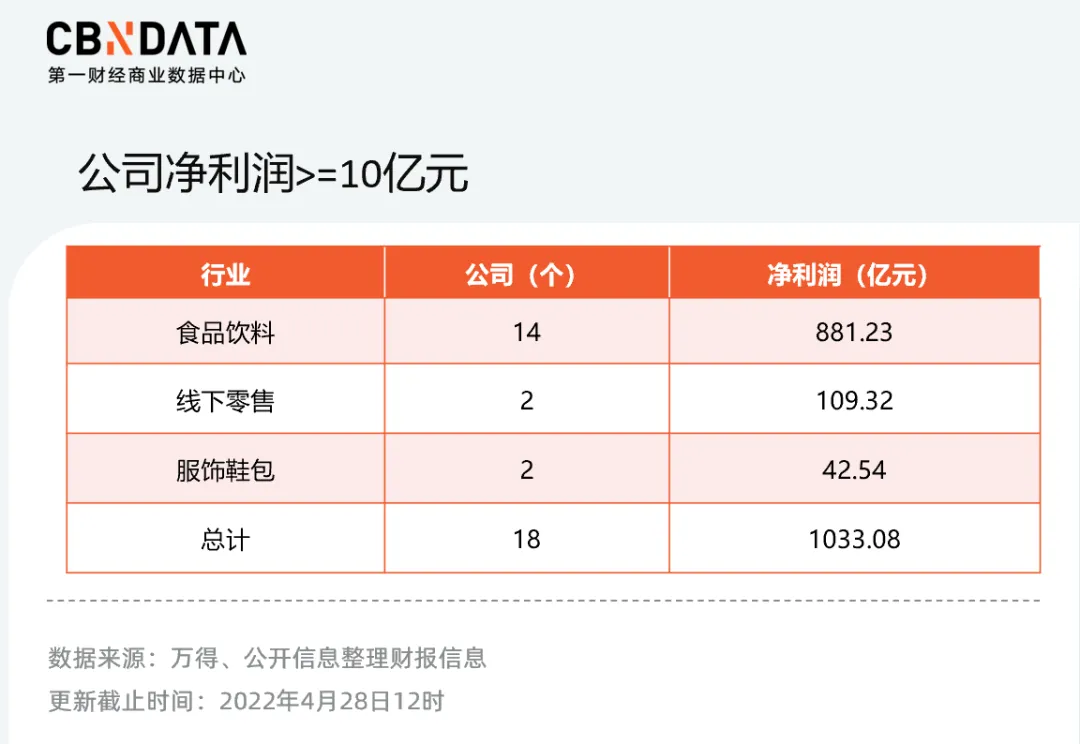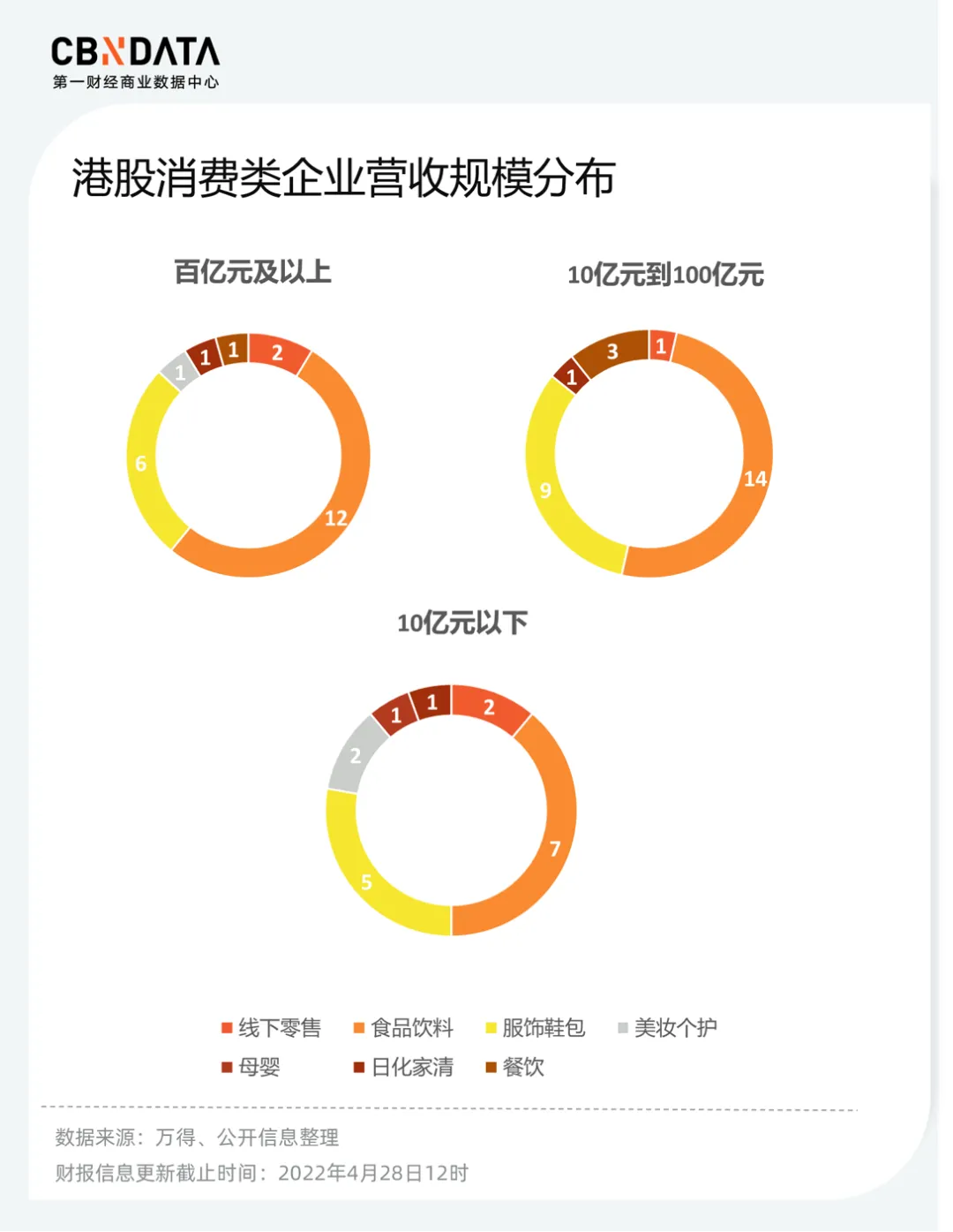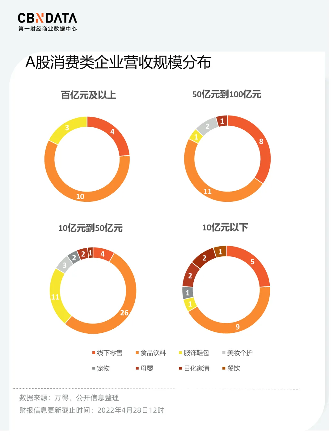 截至4月28日,在A股上市的202家消费类企业中,有111家已发布2021年报,还有91家暂未披露。111家企业中,服饰鞋包企业有56家,其次是食品饮料企业的54家。食品饮料A股上市企业中,有22都是酒企。已披露财报的企业中,营收录得正增长的企业有90家,其中葡萄酒企业“ST中葡”营收同比增幅最高,为129.59%;录得负增长的有19家,其中金字火腿营收同比跌幅最大,为28.79%。我们将已披露财报企业的2021年营收金额分成百亿以上、50亿到100亿、10到50亿和10亿元以下后,各量级的公司行业分布如下:具体来看,百亿级以上营收企业中,新希望、伊利股份、贵州茅台3家营收突破千亿,这3家企业上市时间都已超过20年。其次,中国中免以676.59亿元营收排在第4;双汇发展虽然以666.82亿元营收排在第5,但同比却下降了9.72%,是本次统计的A股消费企业Top5中唯一一个营收下滑的企业。服饰鞋包赛道中,耐克和彪马背后的制造商华利集团,大众休闲服装企业森马服饰的营收也都突破了百亿大关。值得一提的是,近年来备受好评的太平鸟2021年营收也达到了109.21亿元,是唯一一个营收过百亿元的A股新消费品牌公司。在50到100亿元营收的企业中,食品饮料占到11席。其中,三只松鼠和良品铺子以超过90亿元的营收排在前两名,唯一一家跻身50亿到100亿元营收的母婴企业孩子王以90.49亿元营收排在第3。老牌国产美妆企业上海家化和御泥坊母公司水羊股份2021年营收也都突破了50亿大关。2021年刚上市就增长迅猛的东鹏饮料也录得69.78亿元的营收,同比增长40.72%位列其中。在本系列后续的食品饮料篇分析中,我们也将重点分析东鹏饮料2021年的表现。营收10亿到50亿元的企业中,食品饮料企业占了26席,其中有10家是酒企,11家是老牌大众休闲食饮企业,如承德露露、李子园、ST维维。此外,3家宠物A股上市公司中,中宠股份和佩蒂股的营收都在此区间。营收在10亿元以下的企业有21家,仍然是食品饮料企业占大头,2021年刚刚上市的张小泉以及2017年上市的户外运动服饰企业牧高笛都在其中。从总数量来看,港股共有消费类上市公司80家,其中食品饮料和服饰鞋包企业占比之和接近八成,母婴仅有宝宝树集团一家,本土宠物行业暂时还没有赴港上市的公司。在80家业中,有69家企业已披露2021年业绩。其中录得正增长的企业61家,同比涨幅最高的是海伦司,同比增长率达124.42%;仅有8家亏损,其中达芙妮国际同比跌幅最大,达70.95%。按照已披露财报企业的营收规模,我们将它们分为百亿元以上、10亿元到100亿元和10亿元以下3类进行分析,得到行业分布如下:在3个营收量级分类中,食品饮料企业都占据了大头,这与大盘整体情况吻合。港股中不仅有蒙牛乳业、康师傅控股这样营收达到881.41亿元和740.82亿元的“超头”企业,也有农夫山泉、奈雪的茶和周黑鸭一类后来居上的细分行业头部公司。在百亿级营收的企业中,还有安踏体育和海底捞两个亮眼的存在。市值直逼耐克的安踏体育在港股消费企业中,营收已来到第4位;而海底捞2021年虽然“巨亏”,但是营收规模却上涨43.7%,来到411.11亿元,仍然是餐饮行业中“巨无霸”一般的存在。计入8大行业的中概股公司有逸仙电商、波奇网、百胜中国和名创优品,由于各公司2021财年周期不同,因此本篇不对中概股公司做概况分析,后续将会对逸仙电商年报进行详细拆解。注:由于港股对于净利润的定义和A股不同,美股的财报统计周期和A股有所区别且数量较少,因此在这里我们仅针对已披露净利润的110家A股上市公司进行分析。