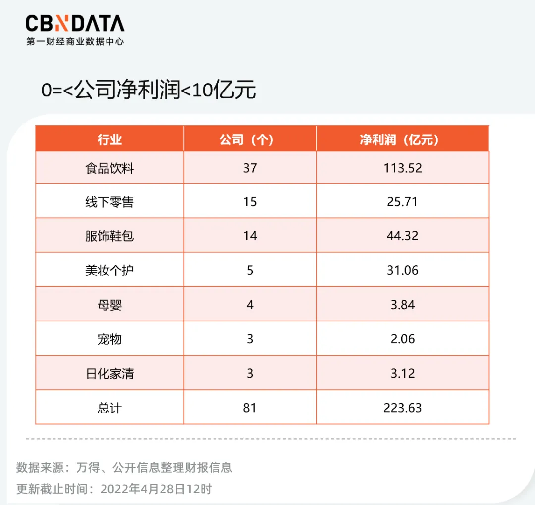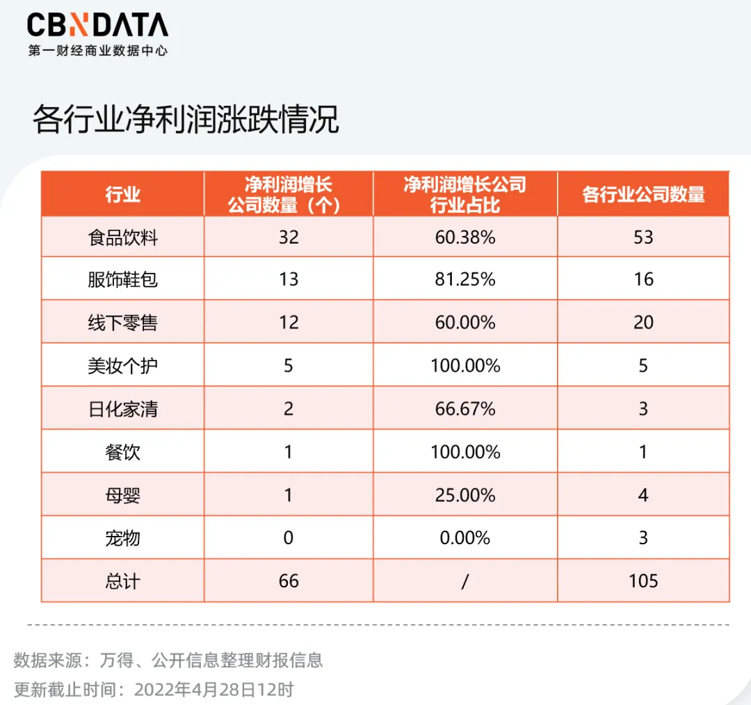 线下零售行业中,中国中免和王府井两家公司在列,其中中国中免2021年营业总收入676.69亿元,较上年同期增长28.65%,净利润95.92亿元,同比增长56.23%。中国中免是中国最大的奢侈品运营商,对于营收和净利润等增长,财报解释,主要是因为公司聚焦免税主业,主抓海南离岛免税市场,离岛免税业务持续保持高增长,以及部分机场租金减免和公司所得税优惠政策等。服饰鞋包行业有2家公司净利润超过10亿元,其中华利集团2021年净利润27.68亿元,同比增长47.34%,且主要营收依靠运动休闲鞋,2021年运动休闲鞋的营收占比高达81.35%。2021财年净利润在0-10亿元的公司中,食品饮料共有37家,数量占比达46%,净利润总计113.52亿元。其次是线下零售和服饰鞋包行业,公司数量占比分别是19%和17%,从净利润汇总来看,虽然两个行业公司数量大致相同,但服饰鞋包行业净利润金额相加几乎是线下零售行业的一倍。美妆个护行业五家公司分别是贝泰妮、华熙生物、珀莱雅、上海家化和水羊股份。日化家清、宠物行业分别有三家公司入列,其中宠物行业净利润最低,净利润合计仅2.06亿元。2021财年净亏损的公司共11家,食品饮料行业净亏损额最多,主要是因为新希望在2021年净亏损95.91亿元,同比下降293.98%。其次是线下零售行业,主要是因为人人乐的亏损。宠物行业无论是企业数量还是净利润都位于末尾,主要受行业规模所限。综上,2021财年食品饮料、线下零售、服饰鞋包、美妆个护行业整体盈利状况较好。由于部分公司财报中未披露净利润增长率,因此这里仅对已披露净利润及净利润增长率的105家公司进行统计。在105家上市公司中,净利润同比增长的公司共66家,占比62.9%,整体来看,2021财年各行业的总旋律是稳中有升,但宠物行业3家公司净利润同比都在下降。首先看美妆个护和餐饮行业,在被统计公司中净利润都取得了同比增长,其中餐饮行业仅统计了一家公司—全聚德,2021年全聚德净亏损1.57亿元,但同比亏损收窄40.07%。其次是服饰鞋包行业,16家公司中仅3家公司2021年净利润下降。其中,潮宏基和迪阿股份净利润同比增长超过100%,潮宏基主要从事中高端时尚消费品的品牌运营等工作,主要产品为珠宝首饰和时尚女包,迪阿股份是DR钻戒的母公司。“女鞋第一股”星期六2021年实现营业收入28.14亿元,较上年同期增长30.81%,但净亏损由盈转亏,且亏损额高达7.04亿元,较上年同期骤降2996.15%。对于巨亏原因,星期六解释称,一方面由于疫情造成的长期持续影响,整体消费需求疲弱,尤其对线下商业销售冲击较大,从而对公司鞋类库存的消化造成极大影响,加上公司因业务转型而产生的额外费用,导致鞋履业务全年均处于经营亏损状态。食品饮料行业中,净利润同比增长的公司在行业中占比60.38%,庄园牧场、保龄宝、兰州黄河、妙可蓝多四家公司的净利润同比增长均超过150%,庄园牧场主营乳制品和乳饮料,保龄宝为元气森林的代糖供应商,是代糖市场的头部企业。另外值得注意的是双汇发展虽然营收和净利润都较高,但营收增长率和净利润增长率双双下降,净利润同比减少22.21%。综上,2021财年美妆个护、餐饮、服饰鞋包行业中公司的生存状况较好,净利润同比增长的公司占比较大,母婴和食品饮料行业中公司的生存状况一般,宠物行业的上市公司净利润均下滑。“放弃幻想,接受现实”,这是青山资本在最近一期推文中提出的口号,但接受现实并不意味着躺平。相反的,更多品牌开始重新梳理发展脉络,探求最原始的增长极。与此同时,一些好消息也不断传来:瑞幸咖啡在风波后快速迎来反弹,达美乐、捞王、百丽等品牌仍在寻求上市。消费品牌的2022会是震荡、沉淀还是蓄势?我们拭目以待。