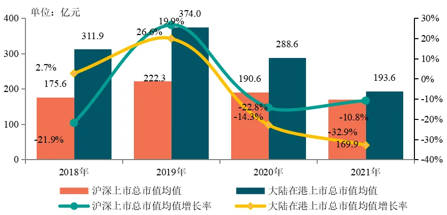 图:2018-2021年沪深及大陆在港上市房地产公司市值均值及其增长率