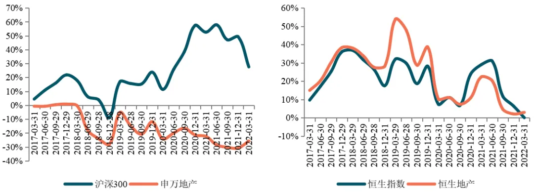 图:2017-2022年一季度房地产板块与大盘涨跌幅度变化情况(1)