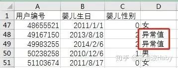 婴儿生日的区间范围是[1984/6/16,2015/8/15],产品销售时间在2012年~2015年,却出现了生日是1984年的婴儿,显然这个1984/6/16的项是异常项,故需删除。