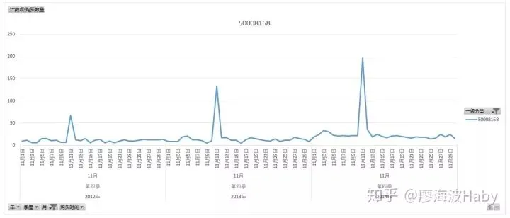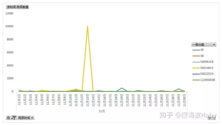 从图中可以明显看到:主要销量来源于类别50014815,查询具体数据发现,11月13日总销量10138,类别50014815就占了10030(99.7%)。