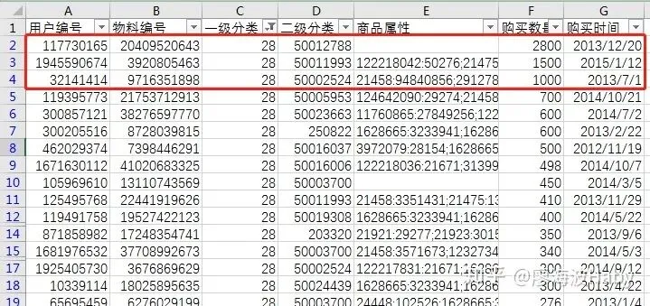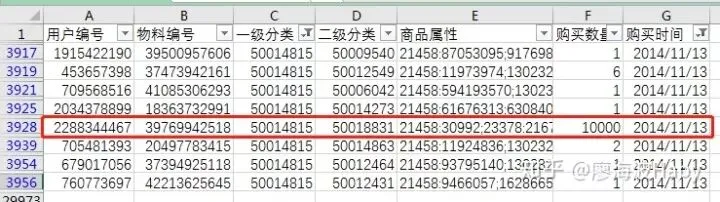 从销售明细可以看出,该类别的商品由用户2288344467单次购买了10000件,占了99.7%(当天共10030),由此可得出以下结论: