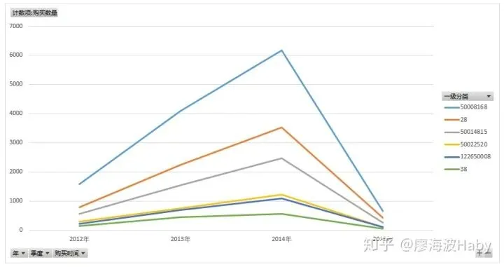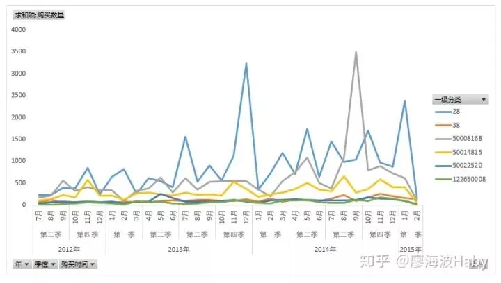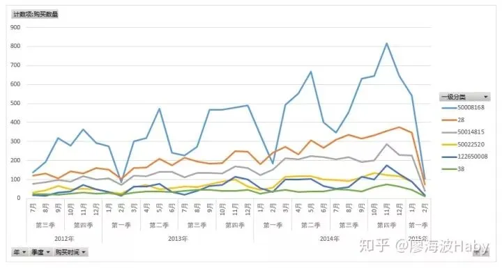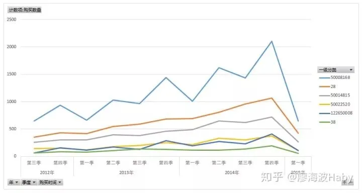2015年只取到2月6日,数据不全,整体上可以看出所有类别的购买人数都是逐年增加。