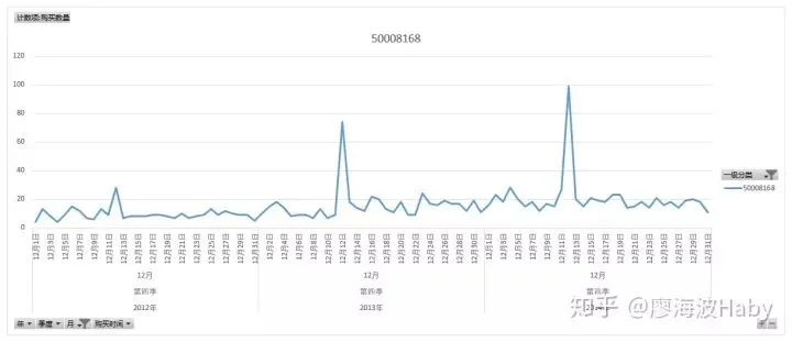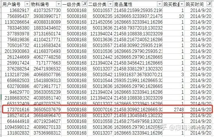 通过同样的方法可以分析出类别50008168在2014年9月20日由用户173701616购入2748件,将此数据记录为“异常数据2”,处理方法参照异常数据1。