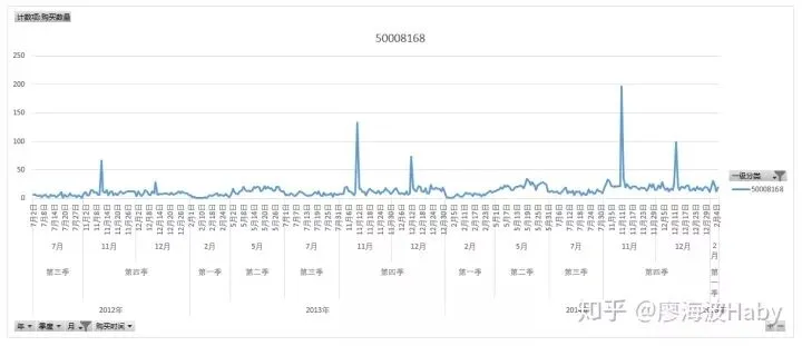 观察类别50008168折线图发现,每年的2月和7月会出现波谷,而5月和11月会出现波峰(2013年是12月出现波峰)。