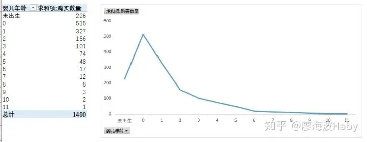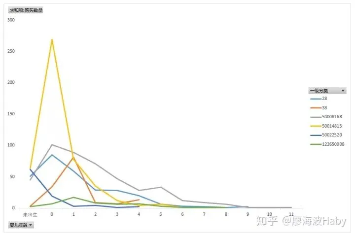 从图表中发现,产品的整体销量随着婴儿年龄的增长而下降,到了6岁之后就基本没有需求了。