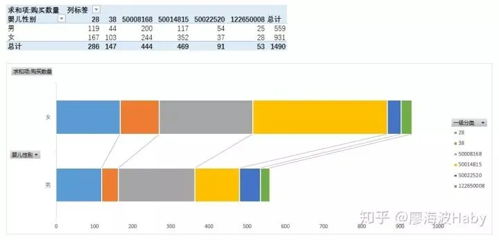 从图表中可以看出:只有类别50022520是男性略高于女性的,其他类别都是女性高于男性,主要差别在于类别50014815,女性购买量是男性的3倍。