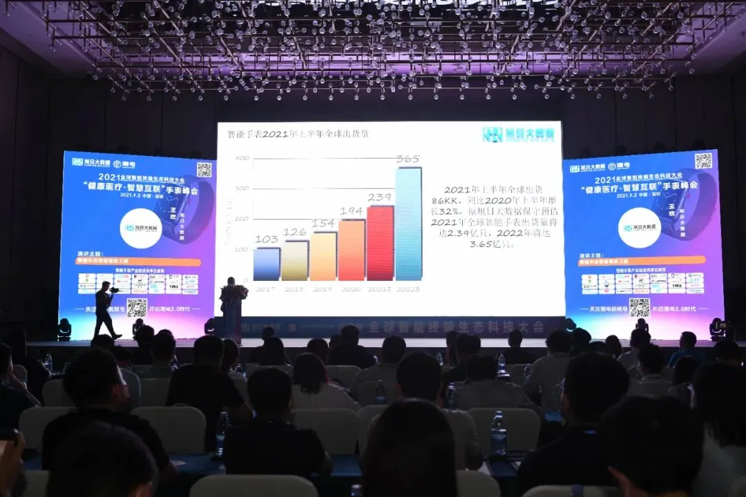 旭日大数据王欢在题为《智能手表晋级管家之路》的演讲中介绍了智能手表2021年上半年的全球出货量,据旭日大数据保守估计,2021年全球智能手表出货量将达到2.39亿只,2022年将达到3.65亿只。