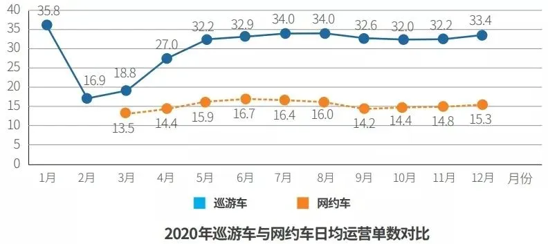 从营运时间和单量上看,2020年出租车日均营运时间18.6小时,日均单数为30.1单,比2019年下降近10单。