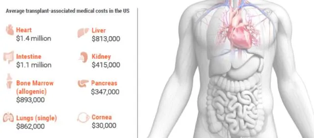 人体器官资源非常匮乏,所以器官移植非常昂贵。据统计在美国器官移植的平均治疗费用为,心脏140万美元、肠110万美元、骨髓89.3万美元、肺86.2万美元、肝脏81.3万美元、肾脏41.5万美元、胰腺34.7万美元、角膜3万美元。所有器官的平均等待时间超过了1年。而3D生物打印技术的进步将会使得器官移植无限制,更经济。