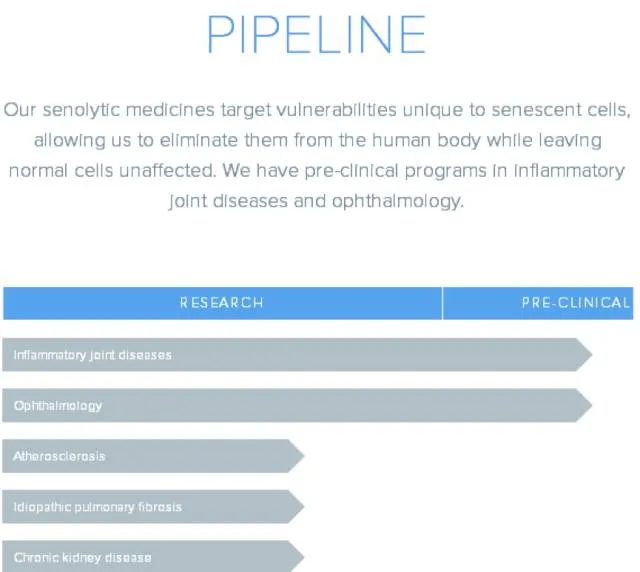 Unity Biotechnology 是一家私有生物技术公司,致力于预防、治疗和改善由于衰老而产生的老年疾病。通过清除衰老细胞,可以治疗由细胞衰老引起的疾病,例如关节炎、动脉硬化、视力下降、肾脏疾病等。UNITY由业界着名风投ARCH Venture Partners和Venrock支持,其国际顶尖的管理团队拥有丰富的创业和药物开发经验,团队共开发过91个进入临床试验的药物,其中13个获得FDA批准。至今公司的融资总额达到1.513亿美元。