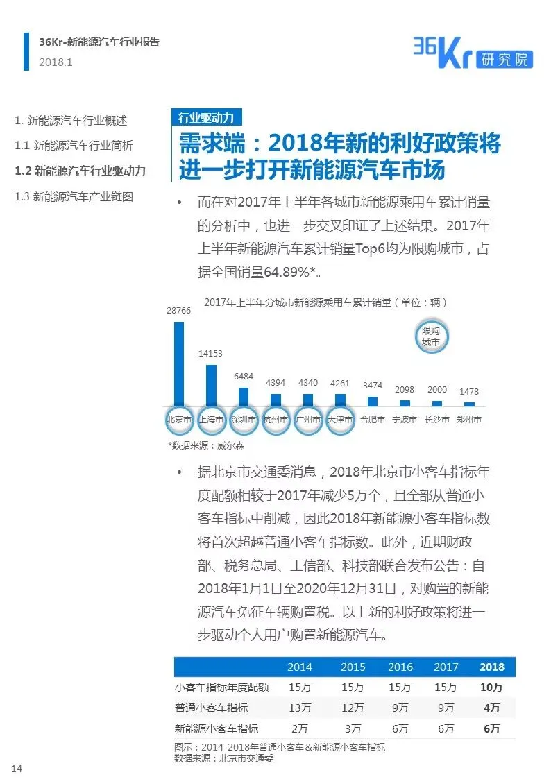 在报告正式开始前,我们想先唠点别的。比如说,2017年有摇到北京车牌儿的老铁么?如果没有的话,那2018年可能更难摇到哦……2018年,北京市小客车指标年度配额将减少5万个,重点是这减少的配额要全部从普通小客车也就是燃油车指标中削减。也就是说新能源小客车指标数将首次超越普通小客车指标数,达到6万个,而普通小客车指标将被压缩到4万。新能源汽车或者说纯电动汽车可能是未来我们拥有一辆北京牌照汽车的最佳选择了。
