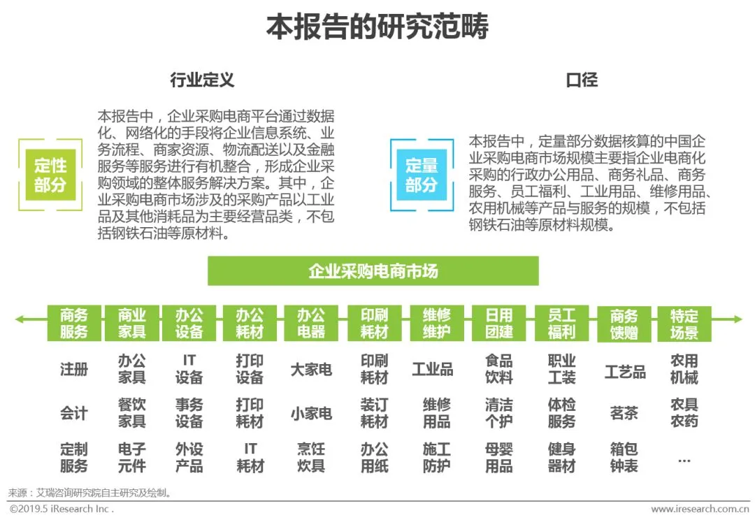 目前中国企业电商化采购需求复杂,涉及商品种类众多:不仅包括通用消费型等标品,还包含维修维护等非标品及商务服务;企业采购电商平台服务场景呈现多元化,对工业、农业、商业领域全覆盖:形成了包含商业服务、办公家具、办公耗材、办公电器、员工福利、商务馈赠、企业定制、维修维护以及现代农业等全场景企业采购生态。
