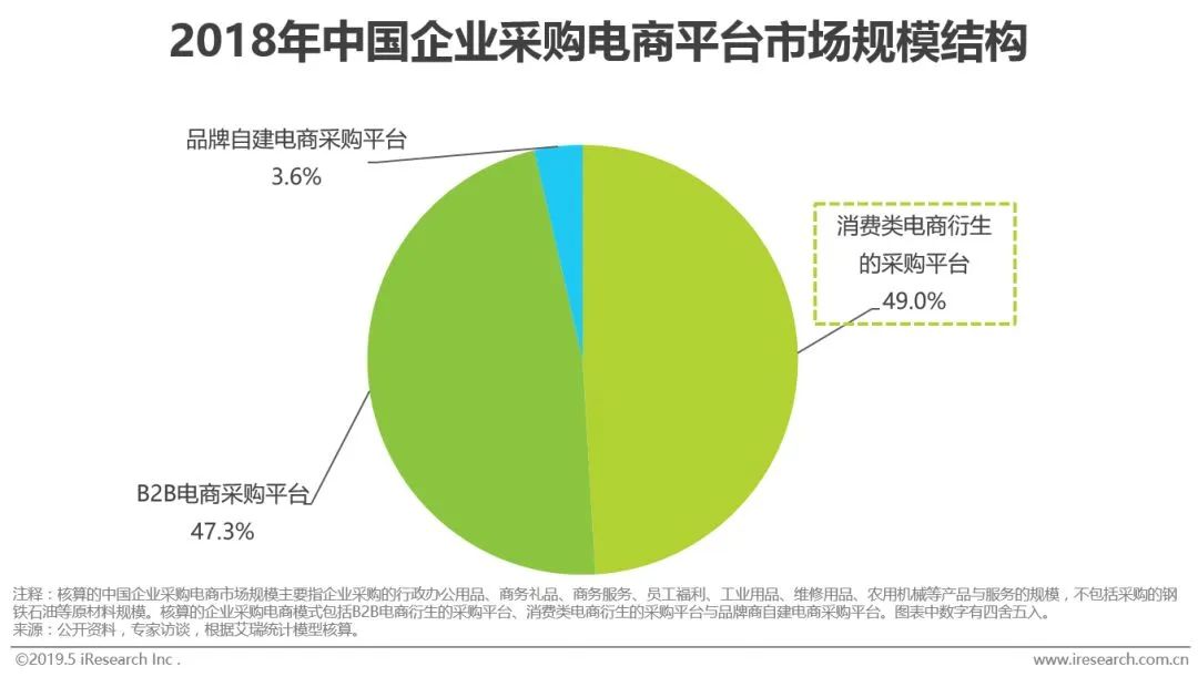 2018年整个企业采购电商平台市场上,消费类电商衍生的采购平台GMV占比49%,B2B电商衍生采购平台GMV占比47.3%,品牌自建电商平台GMV占比3.6%。从市场规模数据上看,消费类电商衍生的采购平台占到整个企业采购电商市场将近一半规模,该类采购平台GMV约3000亿,对整个企业采购电商市场规模贡献最大,是当前行业发展的主导力量。