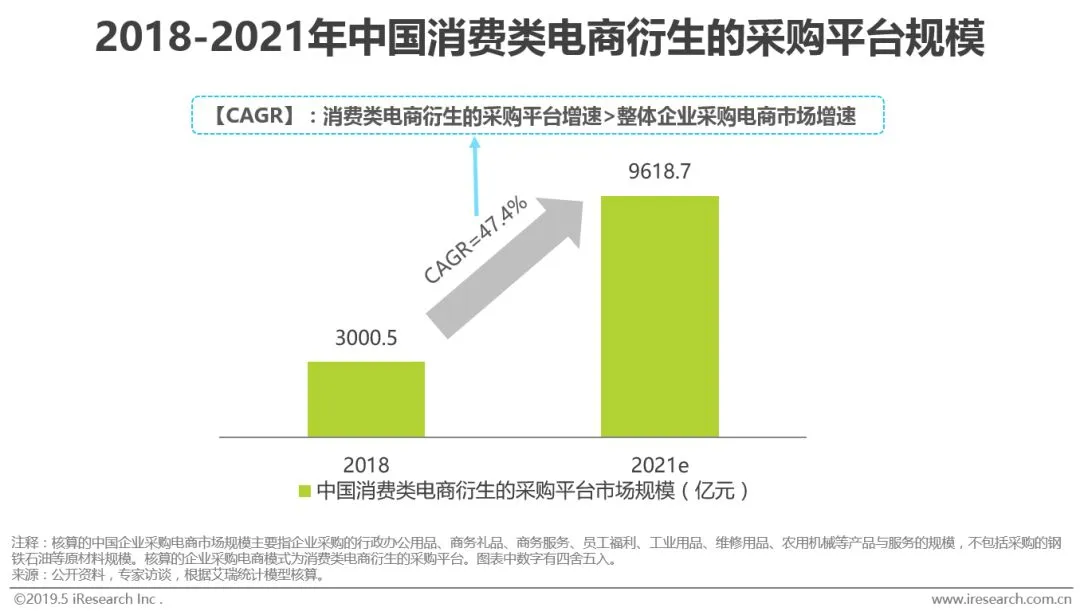 中国企业采购电商市场发展迅速,2018年中国企业采购电商市场交易规模超6000亿元。现阶段,中国企业采购电商市场进入红利发展期,电商行业对B端企业的渗透率也在不断提高。未来随着产业互联网与消费互联网的不断融合,将加快并深化企业采购电商产业链发展,企业采购电商市场发展空间广阔。艾瑞预计,2021年中国企业采购电商市场交易规模超过万亿,约达14431亿元,未来三年复合增长率达33.6%,企业采购电商市场具有巨大的发展潜力。