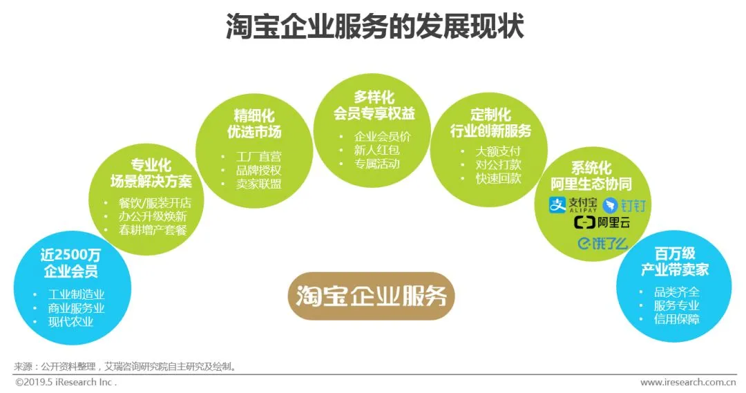 依托丰富的品类优势、专业的卖家沉淀、完备的评价与保障体系,淘宝企业服务形成了包括商业办公、创业开店、员工福利、企业定制、MRO以及工业制造等全场景的企业采购服务生态。2018年11月,淘宝企业服务发布财年成交规模,8个月时间突破1000亿。目前,淘宝企业服务已经成长为大体量、高增长的代表性小微采购平台。