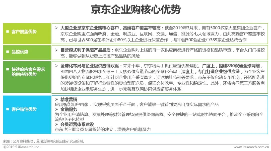 2018年,京东集团将京东企业购作为平台部门独立运营,将京东集团多年来在消费型电商领域积累的丰富经验、大数据资源和强大的技术支撑实力‚一体化地开放给企业客户。京东积极拓展工业品采购领域,同时通过全方位、立体化的企业级服务,促进京东企业购从采购供应商升级为企业采购领域的综合解决方案提供商。
