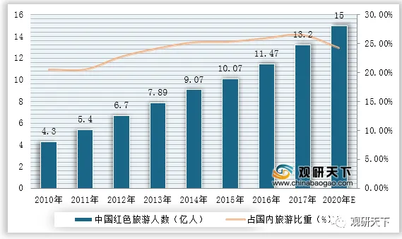 随着我国旅游热度的提升,红色旅游越来越受到游客青睐。2010年我国红色旅游人数4.3亿人,占当年旅游总人数的20.45%,至2017年,我国红色旅游接待游客数13.24亿人,占全国游客数的26.39%。2010-2017年年均复合增长率超过17.38%。预计到2020年,我国红色旅游人数超过15亿人。