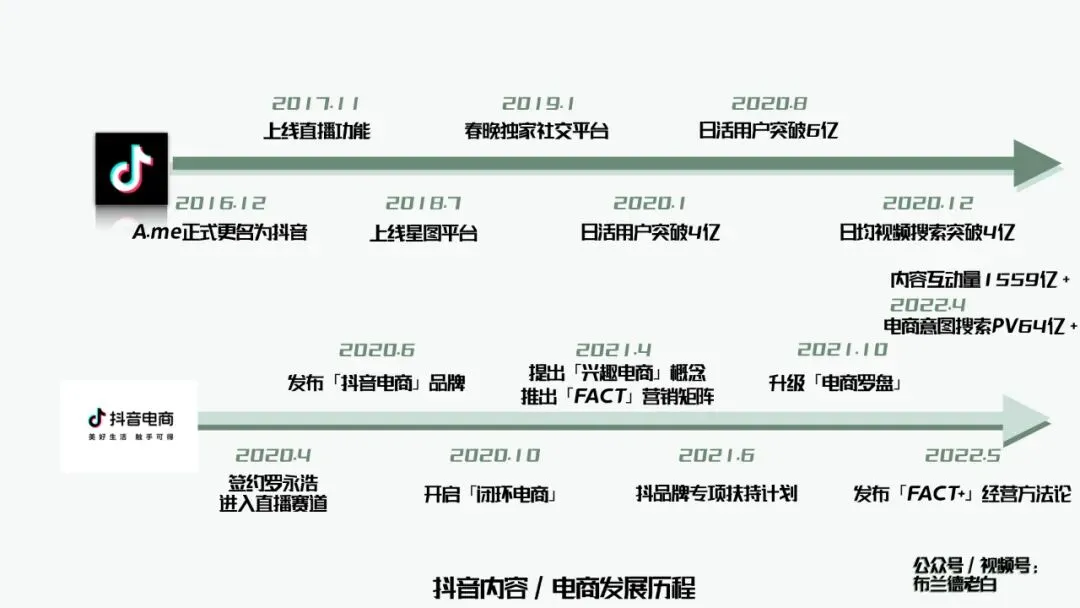 2022年4月,电商意图搜索PV64亿+,内容互动量1559亿+,2022年5月,召开抖音电商生态大会,发布“FACT+”全域经营方法论。