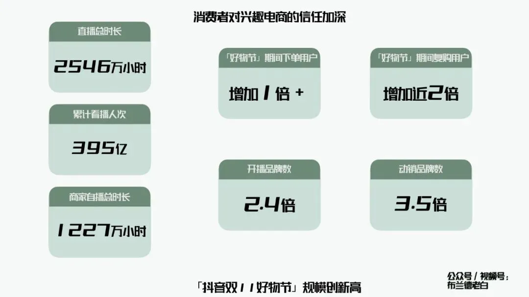 值得关注的是最近一次抖音双11好物节的数据,在需求侧,抖音电商下单用户同比增加1倍+,复购用户则增加近2倍。用户与兴趣电商的信任正逐步加深,并形成消费习惯。而消费习惯的养成离不开优质的内容作为基础:好物节期间抖音内容播放量与交易额的相关系数高达0.96;34个「王牌直播间」更是吸引了7000万+用户看播。