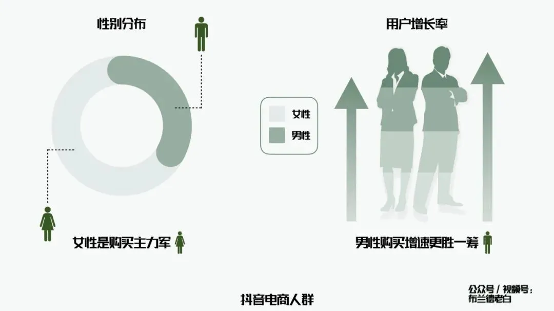 在抖音电商,内容场景与消费场景相互融合,购买用户迅猛增长,用户通过喜欢的达人推荐,发现并购买优价好物,所见即所得。抖音电商用户中,女性用户是购买的主力人群,但最近男性用户的购买增速更快。