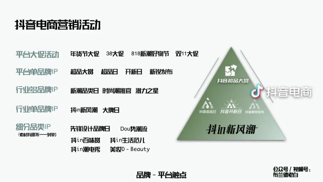 平台营销IP活动:全行业头部品牌商家可参与PK的营销活动—抖音超品大赏、抖音超品日、抖音开心日、抖音新锐发布。
