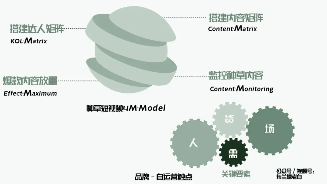 更高阶或者说更难的其实是种草短视频,因为很难衡量,但我认为其实它才是品牌在兴趣电商中最有价值的触点,因为品牌可以通过短视频种草实现从蓄水到收割的完整链路。那怎么做好种草短视频呢?老白总结为4M-Model。