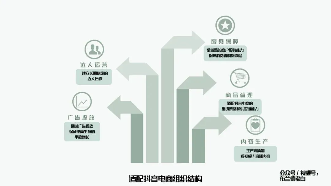 需要围绕兴趣电商用内容链接人和货的经营逻辑,以持续生产优质的商品内容为核心竞争力,优化人员能力与组织结构。需要围绕内容、商品、达人、广告、服务五大维度全面升级组织结构: