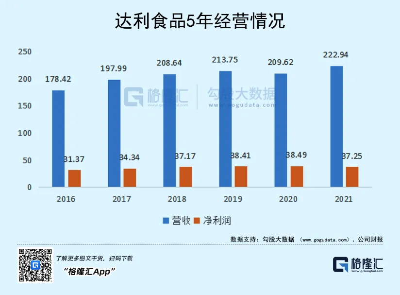 近日,达利食品发布了2021年财报,实现营收229.94亿,同比增长9.7%,规模再创历史新高。实现净利润37.25亿,同比微跌,基本持平,在全球原材料价如PET等价格大幅上升的压力之下,这算一个不错的表现。