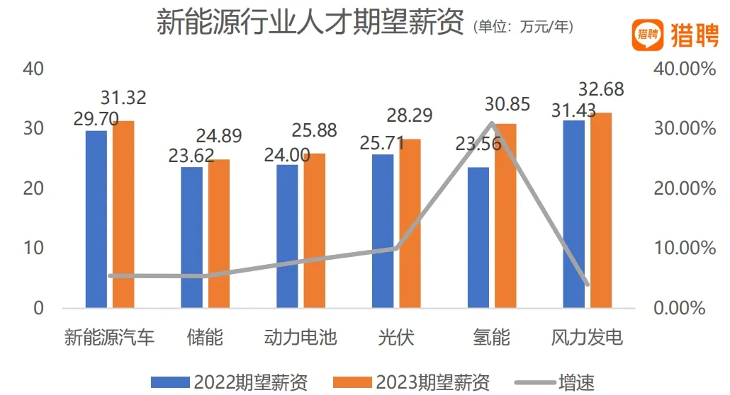 新能源行业人才的期望薪资从2022年26.34万提升到2023年的28.99