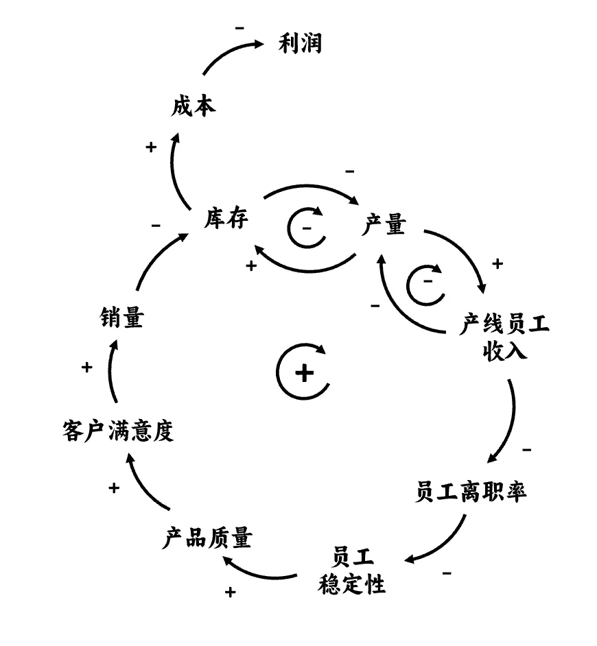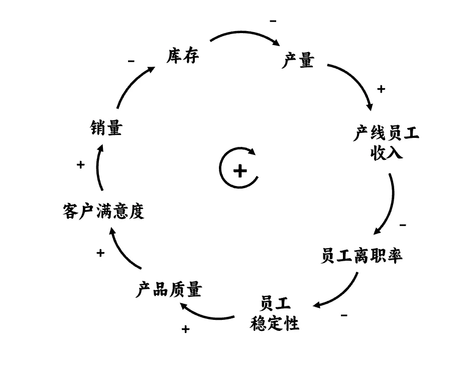 销量下降引发了产量下降,接着产线员工收入减少,离职率上升,员工稳定性降低,最终导致生产的产品质量下降,客户投诉增加,销量继续下滑。