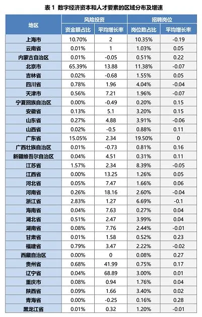 但从资本指标增长率来看,东部数字经济发达地区的风险投资增速相对滞缓,特别是福建、江苏、广东和上海等增长率偏低,整体落后于众多中西部数字经济欠发达地区。以上分析使我们认识到,东部发达地区经济开放度较高,数字经济的高涨往往是由资本大量进入市场而形成的,并不断吸引更多的投资涌入。但当地区资本拥挤度过高,相应降低了总体资本回报率时,资本的逐利性便驱使资金流出,相继进入其他地区以获取超额报酬。在这一作用机制下,资本的跨区域流动造成了不同地区资本要素配置及要素回报率差异,有利于改善不同地区发展失衡状况。