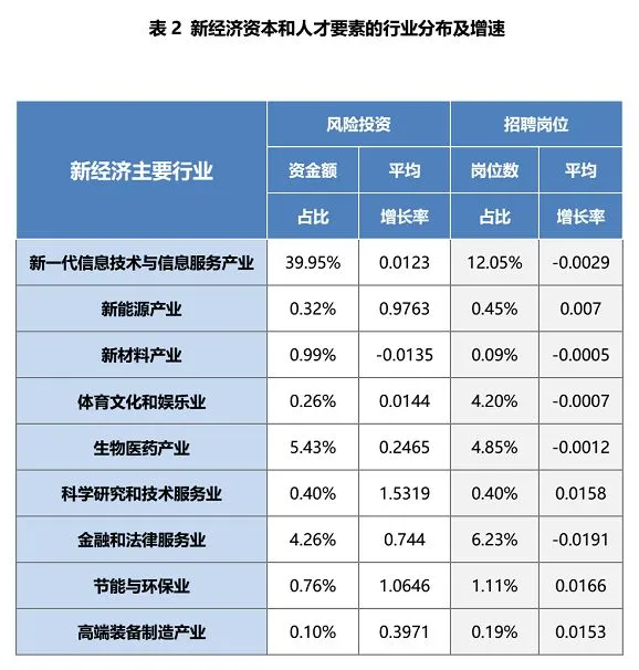 随着实体经济加速向以数字经济为主要载体的新经济转变,数字经济及其催生出的新业态、新模式成为新经济发展的重要引擎。根据实时监测同期新经济各行业资本与人才要素数据可以看出,中国新经济行业企业的风险投资和招聘岗位主要集中在新一代信息技术产业,两项指标占整体经济比重分别达39.95%和12.05%,远超其他新经济行业,是推动新经济发展最重要的组成部分。但从新经济行业指标增长率分析发现,新一代信息技术与信息服务产业招聘增长率为负,风险投资指标增速也在放缓,低于大多数新经济行业。
