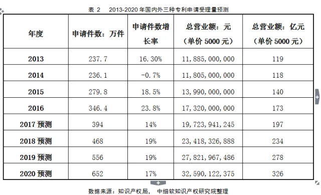 按国内5家代理机构(柳沈、中细软、知果果、超凡、八戒)平均代理费计算(发明专利9500元,实用新型专利4000元,外观设计专利1500元,即计算平均代理费为5000元),2017年总营业额将达到197亿元;预计2020年全国专利申请总量将在652万件,总营业额将达到326亿元。